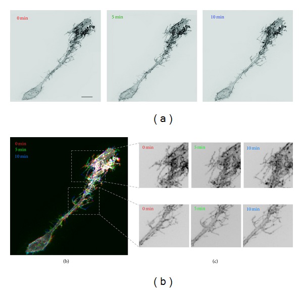 Figure 1. Radial glia process movement in vivo is apparent over a timescale of minutes. (a) Maximum intensity projections of two-photon microscope z-series images of a radial glia cell expressing farnesylated EGFP in the intact tadpolebrain. (b) RGB overlay of the time-lapse images of a radial glia cell where red denotes the position of the cell at 0 minutes, green after 5 minutes, and blue after 10 minutes of imaging. (c) Magnified images of several highly dynamic sites from the radial glial cell shown in (b). Scale bar = 10âμm.