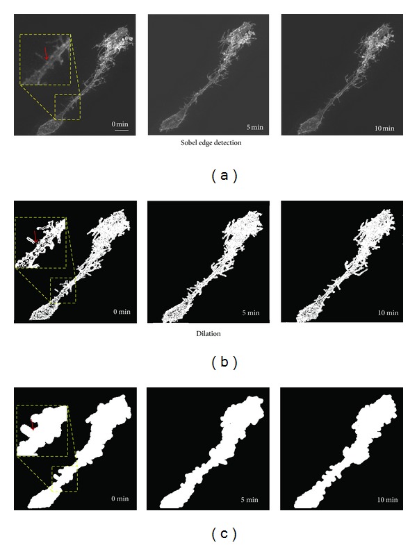 Figure 2. Image preprocessing for analysis. (a) Maximum intensity projections of two-photon images of a radial glia cell expressing farnesylated EGFP in vivo collected at 0, 5, and 10 minutes. (b) Same images after Sobel edge detection and binarization. (c) Binarized images underwent dilation with a 6-pixel radius. Pixel dilation helps eliminate artifactual discontinuities in the images (arrowhead in insets) resulting from the binarization step. Scale bar = 10 μm.
