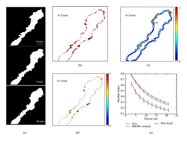 Figure 3. Analysis of pixel redistribution using boxcar averaging. (a) Preprocessed images from 0, 5, and 10 minutes time points. (b) Subtracting consecutive images from one another creates a map of the redistributed pixels between time points, shown in red. (c) Boxcar averaging of the pixel redistribution images from (b) using 9 × 9 pixel window. (d) Result of multiplication of the images in (b) and (c). The average of the nonzero pixel values in this image is used to calculate the cell motility index. (e) Plot of motility index values obtained for the datasets in Figures 5(c), 5(d), 6(c), and 6(d) using a range of different boxcar sizes. Motility values in the different conditions are most clearly separated when a 9 × 9 pixel boxcar size is used. Scale bar = 10 μm.