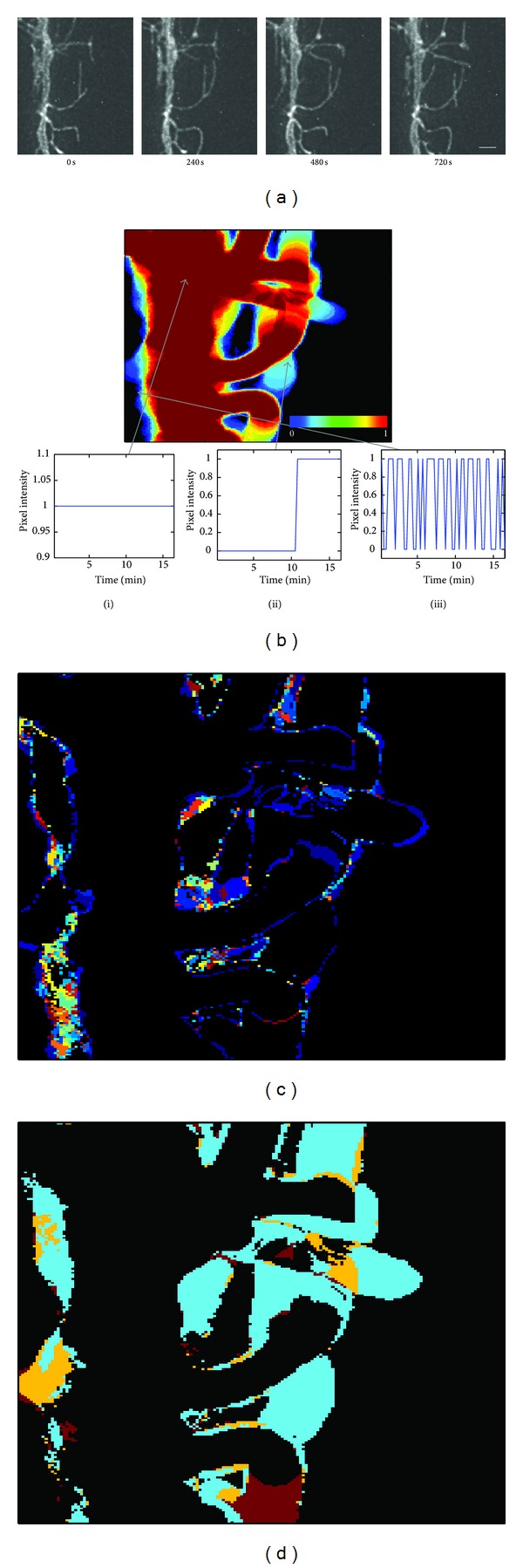 Figure 4. Temporal frequency filtering helps exclude artifactual pixel redistributions. (a) Time series of two-photon images of a portion of a radial glia cell. Scale bar = 2 μm. (b) Integrated intensity of a healthy cell over the course of 18 minutes, preprocessed for analysis. Red pixels have a value of 1 during most time points and blue pixels during few time points. Black pixels are negative background sites with value 0 at all time points. Time-dependent pixel intensity functions (i) for a pixel located within the main process, (ii) for a pixel into which a filopodium extended, and (iii) for a noisy pixel located along the edge of the cell. (c) Frequency map showing noisy pixels that were discarded by temporal frequency filtering. The colors represent discrete high frequencies measured in the excluded range. (d) Frequency map of the same cell, showing pixels that were accepted by the frequency filter. Each color shows a discrete frequency within the accepted range. In (c) and (d), black represents sites where pixel intensity did not change over the 18 minutes.