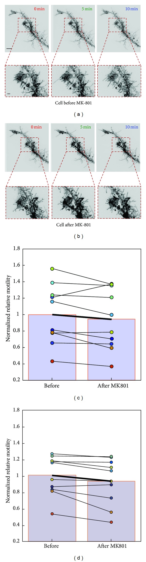 Figure 5. Comparing the relative sensitivity of the two motility measurement methods using images of normal radial glia cells (N = 10) before and after injection of 100âμM MK-801 into the ventricle of the tadpole to reduce motility. ((a), (b)) Example of glial motility before (a) and after (b) drug treatment. (c) Motility index changes measured using Method 1 from [15]. (d) Results using the boxcar-based Method 2. Each individual cell is depicted with the same color in (c) and (d). Note that Method 2 gives more consistent results. All values are normalized to the mean predrug motility index to facilitate comparison. Scale bar = 10âμm in upper panel and 2âμm in lower panel of (a).