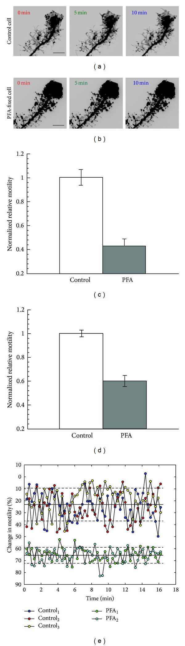 Figure 6. Use of paraformaldehyde- (PFA-) fixed cells to reveal nonbiological artifacts that contribute to the motility index scores. (a) The motility of control living cells (N = 4) was compared with (b) dead cells fixed in paraformaldehyde (N = 5). ((c), (d)) Bars indicate the motility values of the two groups normalized to the mean of control values using Method 1 in (c) and Method 2 in (d). Error bars are SEM. (e) Applying a low-pass temporal frequency filter with a threshold of 0.0026 Hz (6.4 min period) reduces the motility index scores (measured using Method 2) of the PFA-fixed cell group by substantially more than the control group, indicating that the filter is effective at eliminating nonbiological noise. Dashed lines indicate full width at half maximum. Scale bars = 10 μm.