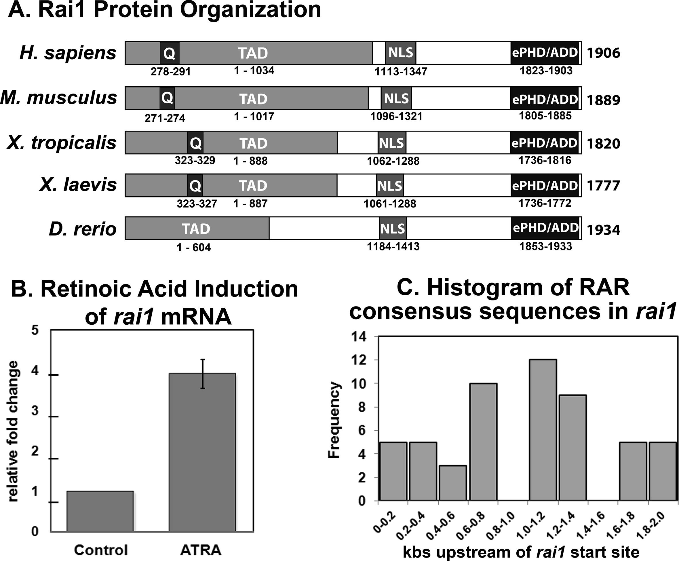 Fig. 1 â RAI1/Rai1 protein organization and induction by retinoic acid. (A) A schematic representation of the Rai1 protein in human, mouse, two frog species (X. laevis and X. tropicalis), and zebrafish. This illustrates that the organization of the primary protein domains, including the Trans-Activation Domain (TAD), Nuclear Localization Signal containing region (NLS; see Supplementary material Fig. S1B for details), and extended plant homeodomain (ePHD/ADD, also known as a PHD finger) are conserved in the species examined (see Supplementary material Fig. S1A for sequence alignment of the PHD finger). A 14 poly-glutamine stretch (Q) is found in humans and reduced glutamine stretches can also be found in a similar region of other species except zebrafish. The NLS region contains the first known nuclear localization sequence (Darvekar et al., 2013). Figure not to scale. (B) Retinoic acid induces expression of rai1 during Xenopus development. Quantitative PCR of rai1 mRNA after all-trans retinoic treatment (ATRA) at stage 23 showing significant 3.91-fold increase (t-test, p = 0.0037) relative to the control housekeeping gene (ef1 alpha). (C) Retinoic acid may directly regulate rai1. A histogram of RAR binding sites in a 2 kb region upstream of the rai1 start site in X. laevis reveals the enrichment of retinoic acid receptor binding sites.