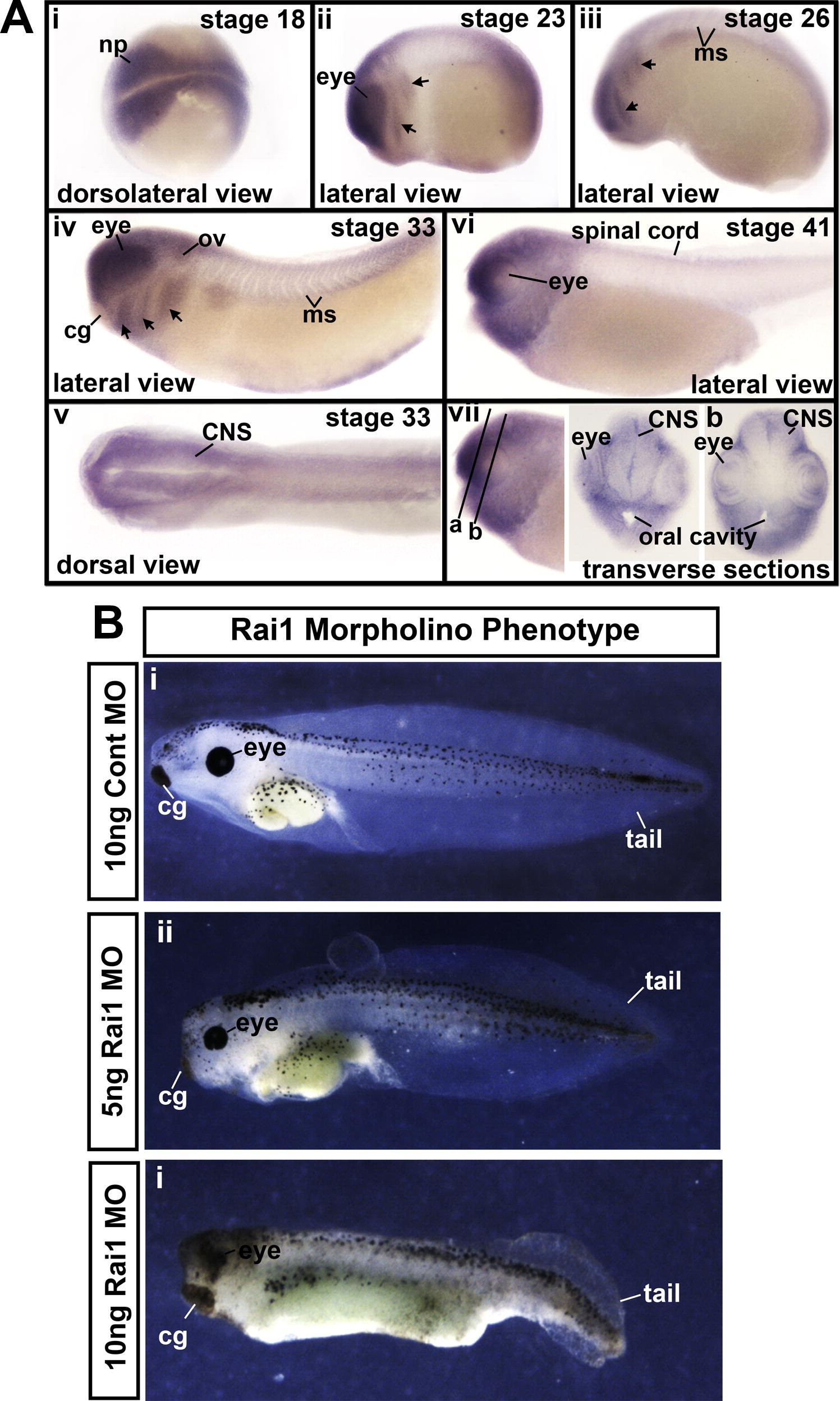 Fig. 2 Expression and loss of function reveal a role for Rai1 in craniofacial and brain development. (A) In situ hybridization of rai1 mRNA in Xenopus tropicalis. (i) Dorsolateral view at stage 18â19 revealing labeling throughout the developing nervous system. (ii) Lateral view of stage 23, revealing rai1 in the presumptive migrating neural crest (arrows) and eye. (iii) Lateral view of stage 26 revealing rai1 in the presumptive migrating neural crest (arrows). (iv) Lateral view of stage 33 revealing rai1 in the branchial arches (arrows) eye, optic vesicle (ov) and muscle segments (ms). (v) Dorsal view at stage 33 revealing rai1 in the central nervous system (CNS). (vi) Lateral view at stage 41 revealing rai1 throughout the head. (vii) Transverse sections through the head at stage 41 revealing that rai1 is primarily located outside the CNS in the tissues of the face at this stage. Abbreviations, np; neural plate, ms; muscle segments, ov; otic vesicle, cg; cement gland, CNS; central nervous system. (B) Decreased function of Rai1 results in dramatic effects on Xenopus laevis development including craniofacial defects. (i) Lateral view of representative embryo at stage 42 injected with control morpholino (MO). (ii) Lateral view of representative embryo at stage 42 injected with 5 ng of MO. Defects include digestive tract, shortened tail and smaller head. (iii) Lateral view of representative embryo at stage 42 injected with 10 ng of Rai1 MO. There are severe defects in digestive tract, tail and head development.