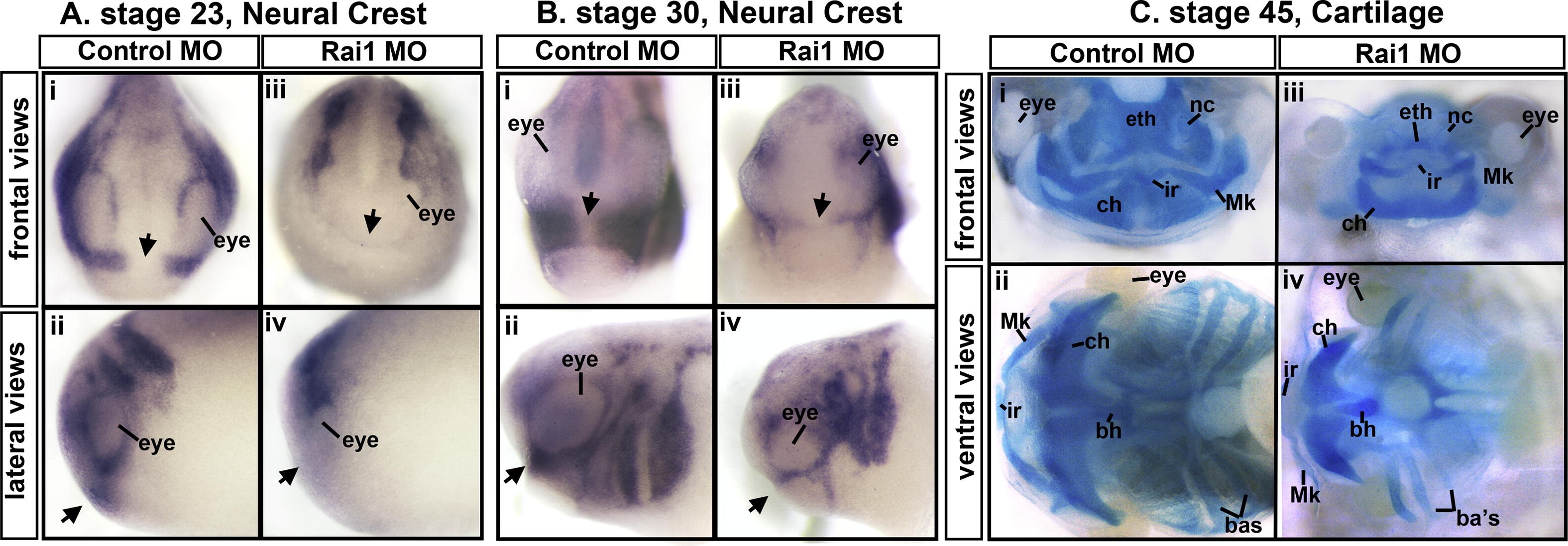 Fig 4. Rai1 is critical for neural crest migration and to establish correct cartilage size. Rai1 morphants injected with 5 ng of morpholino were used for analysis. (A) in situ hybridizations of the neural crest marker, ap-2 in control (i, ii) and Rai1 morphants (iii, iv), showing an aberrant pattern of neural crest during early migration (stage 23). Arrows indicate position of the developing embryonic mouth for context. (B) in situ hybridizations of ap-2 in control (i, ii) and Rai1 morphants (iii, iv), showing an aberrant pattern of neural crest after migration (stage 30). Arrows indicate position of the developing embryonic mouth for context. (C) Cartilage labeling by Alcian Blue in control (i, ii) and Rai1 morphants (iii, iv) illustrates a decreased size of cartilage elements at stage 45. Abbreviations: eth; ethmoid, nc; nasal capsule, MK; Meckelâs, ir; infrarostral, ch; ceratohyal, ba; branchial, bh; basohyal.