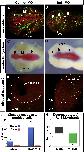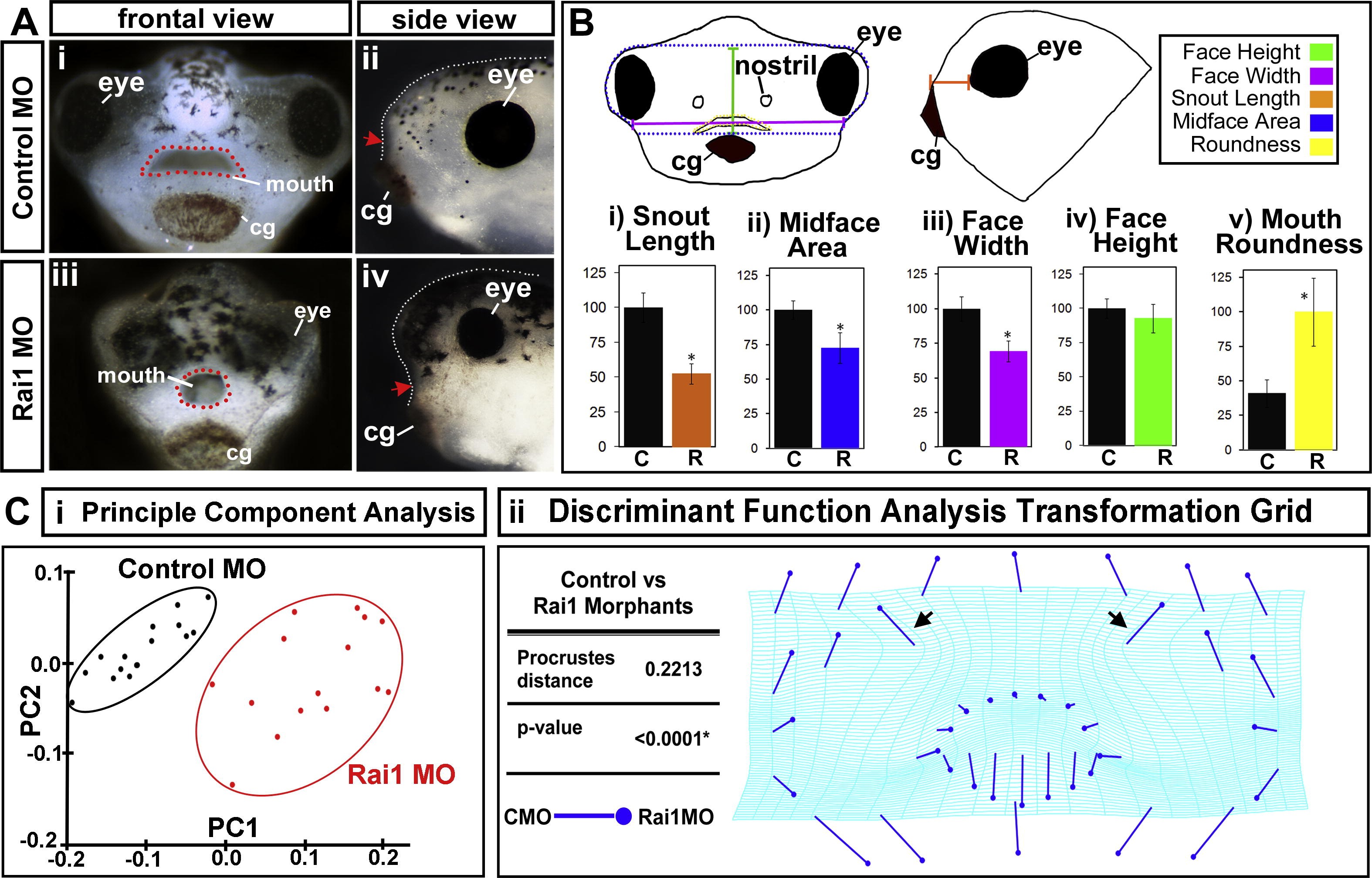 Fig. 3 â Rai1 is required for normal orofacial development. Rai1 morphants injected with 5 ng of morpholino were analyzed at stage 42. (A) Representative frontal views (i, iii) and lateral views (ii, iv) of embryos injected with 5 ng of Rai1 and control MO. The mouth is outlined in red dots (i and iii) or indicated with a red arrow (ii and iv). In lateral views (ii and iv) the head is outlined with white dots to emphasize the protruding forehead. The snout appears shorter and the mouth is smaller and rounder in the Rai1 morphants than controls. Abbreviations: cg; cement gland. (B) Traditional measurements of facial dimensions in Rai1 morphants verses controls. Schematics indicate where measurements were taken. Data as bar graphs (iâ v), show statistically a shorter snout, smaller midface area, a narrower face, and rounder mouth. (C) Morphometric analysis of orofacial shape in Rai1 morphants supports tradition measurements and provides details of changes in orofacial shape. (i) Principal component analysis shows distinct separation of orofacial shapes in Rai1 morphants and controls. Control morphants are in black and Rai1 morphants are in red. (ii) Discriminant function analysis showing the statistically significant procrustes distance and p-value as well as the transformation grid of the changes in landmark location. Note the dramatic shift in nostril landmarks (arrows) and corresponding warping in the midface indicative of midface hypoplasia. Also notable is the shifts in mouth landmarks consistent with a rounder shape mouth.