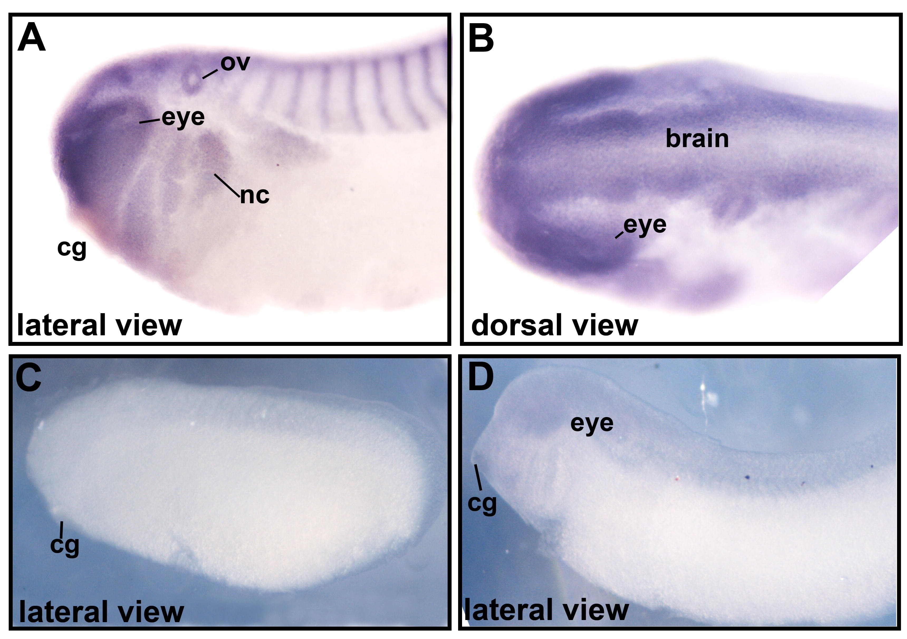 Supplementary Figure 2. A,B) Xenopus laevis in situ hybridization using a probe generated from the 3âUTR of the Xenopus tropicalis rai1 sequence. The region shares a 66% nucleotide similarity with the same region of the X. laevis rai1 gene and showed a highly similar staining pattern in X. laevis embryos. The probe sequence did not match any other sequence in either Xenopus species with identity of greater than 20% or with a stretch of nucleotides longer than 50. C,D) The sense or negative control probe show no significant staining pattern. A blue background was necessary to show contrast with the starkly white embryos.