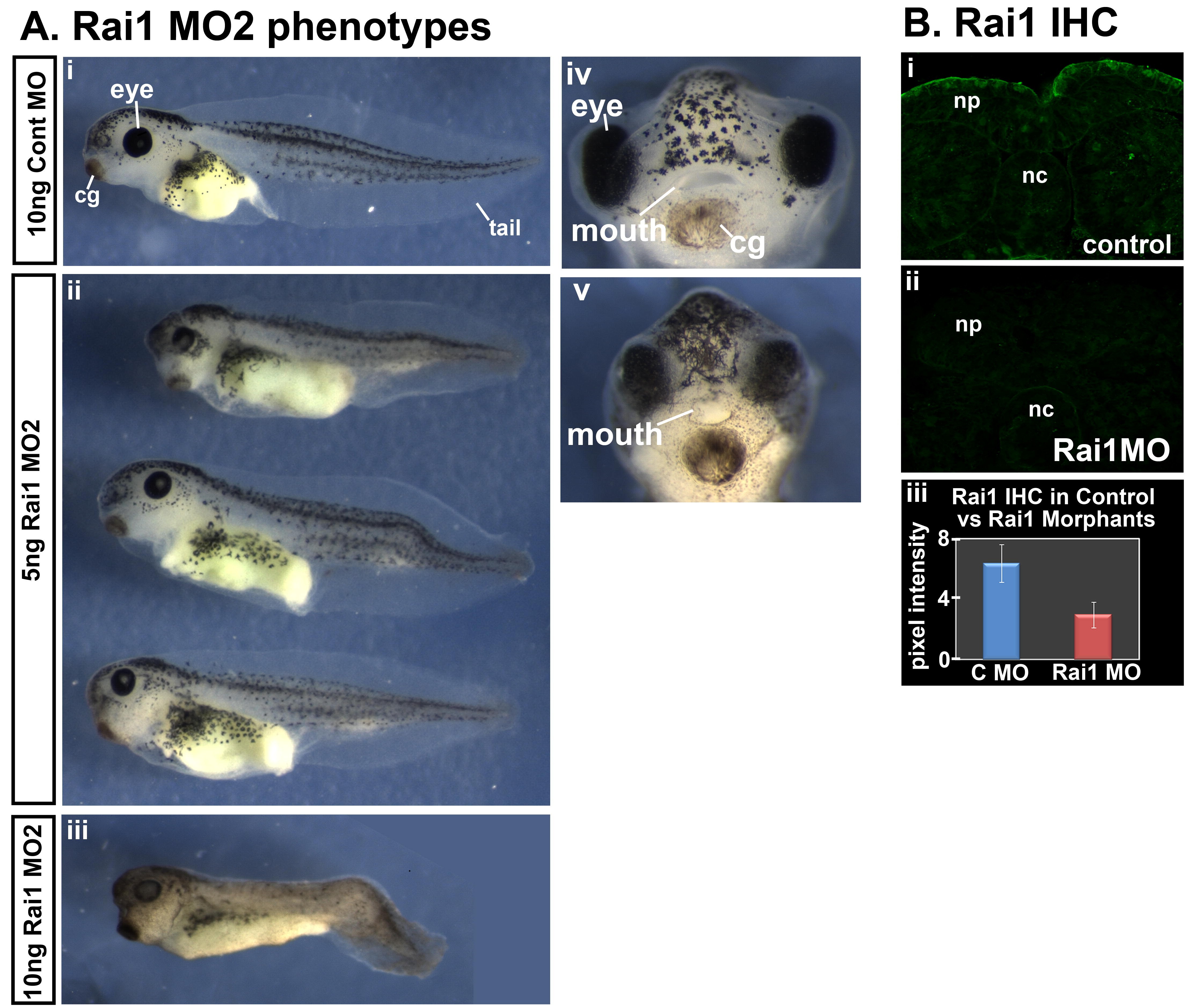 Supplemental Figure S3) Establishing Rai1 morpholino specificity. A) A second translation blocking morpholino (Rai1 MO2) results in very similar phenotypes as the first morpholino used in this study. (i) Lateral view of representative embryo at stage 42 injected with control morpholino (Cont MO). (ii) Lateral view of three representative embryos at stage 42 injected with 5ng of Rai1 MO2. Defects include malformed digestive tract, shortened tail and smaller head. (iii) Lateral view of representative embryo at stage 42 injected with 10ng of Rai1 MO. There are more severe defects in the digestive tract, tail and head. (iv) Frontal view of the face of a control embryo at stage 42. (v) Frontal view of the face of an embryo injected with 5ng of Rai1 MO2. The face is narrower and the mouth rounder as in embryos injected with the same amount of original Rai1 morpholino. B) (iv) Transverse section of stage 20 embryo injected with control MO and labeled with antibodies to human RAI1. (v) Transverse section of stage 20 embryo injected with Rai1 MO and labeled with human Rai1 antibodies revealing a noticeable decrease in immunofluorescence. (vi) Quantification of Rai1 immunofluorescence by pixel intensity using photoshop software. Results show a 2.16 fold decrease that is significant (t-test, p=0.000116, n= 10). Abbreviations, np; neural plate, nc; notochord, cg; cement gland.