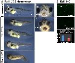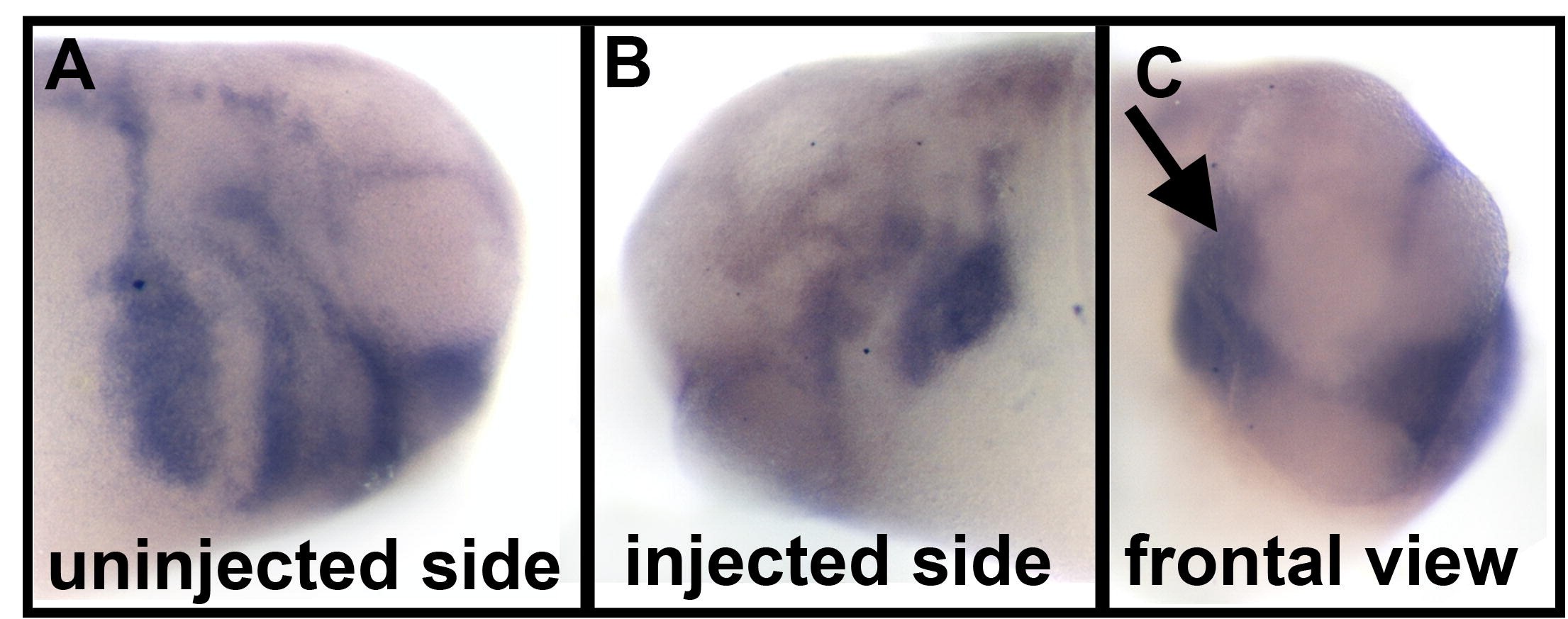 Supplemental Figure S4. in situ hybridizations of ap-2 (a neural crest marker) in embryos injected into one cell at the two cell stage. These embryos have morpholino in one bilateral half of the body. Control embryos were not different than controls injected at the one cell stage and therefore is not shown. A) Shows the uninjected side displaying normal ap-2 expression pattern. B) Shows the injected side in the same embryo as A. ap-2 expression is clearly aberrant. C) Shows a frontal view of the same embryo from A and B. The arrow is pointing to the injected side.