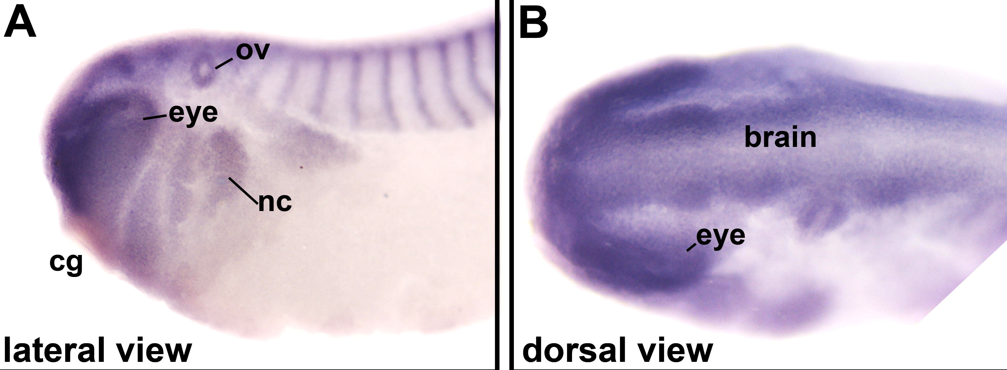 rai1 (retinoic acid induced 1) gene expression in Xenopus laevis embryo, head and trunk region only, assayed via in situ hybridization, NF stage 28, lateral view, anterior left, dorsal up (image on left); and dorsal view anterior left, dorsal up ( image on right).