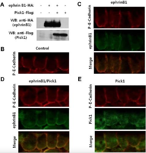 Fig. 4. Pick1 repairs ephrinB1-induced disruption of AJs. Embryos were injected with or without 400 pg ephrinB1 and 500 pg Pick1 RNAs in both the blastomeres of 2-cell stage embryos and those collected at stage 10.5. Immunostaining with phospho-E-cadherin, Flag, and HA antibodies was performed on cryosections. (A) Lysates from embryos were tested for the expression of ephrinB1 and Pick1. Western blot was performed using anti-HA and anti-Flag antibodies. (B) Control embryos showed stable localization of phosphorylated-E-cadherin along cellâcell boundaries in cell junctions. (C) The over-expressed ephrinB1embryo with disrupted cellâcell junctions. (D) The redistribution of phosphorylated-E-cadherin by ephrinB1 over-expression was significantly repaired by appropriate amounts of Pick1 RNA. (E) The over-expressed Pick1 did not affect cell junction formations. Red: Phosphorylated-E-cadherin, Green: ephrinB1, Blue: Pick1, Last row (merged). (For interpretation of the references to color in this figure legend, the reader is referred to the web version of this article.)