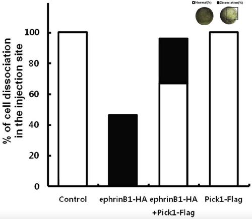 Supplementary Figure 2. Association of ephrinB1 with Pick1 in Xenopus epithelial cells. Embryos were injected with or without 300 pg ephrinB1 and 500 pg Pick1 RNAs and were injected with or without 10 ng Pick1MO and 150 pg ephrinB1 RNA into both the blastomeres of 2-cell stage embryos and those collected at stage 9.5. (A) Dissociation degree of cells was scored as: less than 30%, Mild; more than 30% of the animal pole region, Severe. (B) The histogram denotes the percentage of cell dissociation of the injected site for each sample.