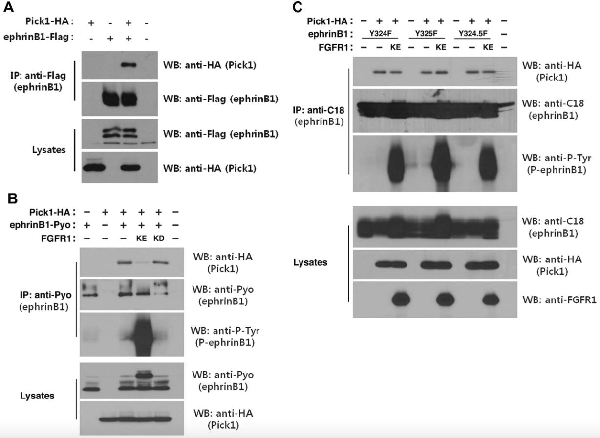Fig. 1. Interaction between Pick1 and ephrinB1. (A) Full-length Pick1 fused to a C-terminal HA epitope tag (10 ng Pick1-HA) and full-length Xenopus ephrinB1 harboring a Flag epitope tag at the C-terminus (10 ng ephrinB1-Flag) were co-expressed in Xenopus oocytes for Co-IP/western blot analysis. Oocyte lysates were immunoprecipitated with Flag antibody and western blots were performed with the indicated antibodies. (B) Xenopus oocytes were each injected with 10 ng RNAs as indicated and lysates were subjected to Co-IP/western blot analysis. Co-expression with constitutively active FGFR1 K562E (KE) resulted in loss of binding between Pick1 and ephrinB1. However, co-expression with kinase dead FGFR1 C289R/K420A (KD) had no effect on the Pick1 and ephrinB1 interaction. (C) Xenopus oocytes were each injected with 10 ng RNAs as indicated and lysates were subjected to Co-IP/western blot analysis. Even co-expression of mutant ephrinB1 on PBM (Y324F, Y325F, Y324.5F) with constitutively active FGFR1 KE resulted in no effect on the Pick1 and ephrinB1 interaction.