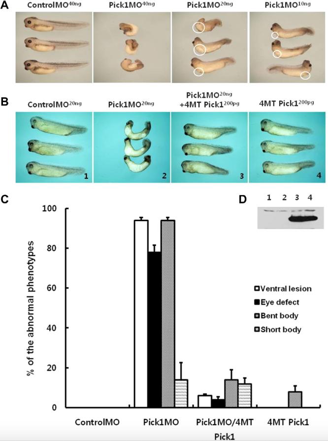 Fig. 2. Pick1 knock-down causes defects in ventraltrunk formation and epidermal cell dissociation. (A) Embryos injected with Pick1MO (10 ng, 20 ng, 40 ng) into both blastomeres at the 2-cell stage. Pick1MO embryos showed bent and shorter body axis, inhibition of eye development, and reduced brain size. The ventral cell dissociation is shown (white circle). (B) Abnormal phenotypes including the ventral lesion caused by the loss of Pick1 significantly rescued by co-injection with 200 pg of 4MT Pick1 mRNA. (C) The histogram denotes the percentage of embryos with defects as described in (B). Note: Pick1 MO-injected embryos showed significant developmental defected embryos (ventral lesion, 94.0 ± 1.41%; eye defect, 78.0 ± 3.54%; bent body, 94.0 ± 1.41%; short body, 14.0 ± 8.49%; n = 60). Co-injection of Pick1MO and 4MT Pick1 into the embryos significantly restored the phenotypic defects as compared to Pick1MO alone (ventral lesion, 6.0 ± 0.71%; eye defect, 4.0 ± 1.41%; bent body, 14.0 ± 4.95%; short body, 12.0 ± 2.83%; n = 55), while over-expression of Pick1 showed minor defects such as a slightly bent axis (bent body, 8.0 ± 2.83%; n = 55). (D) 4MT Pick1-injected embryos were tested for expression. Western blotting was performed using an anti-Flag antibody.