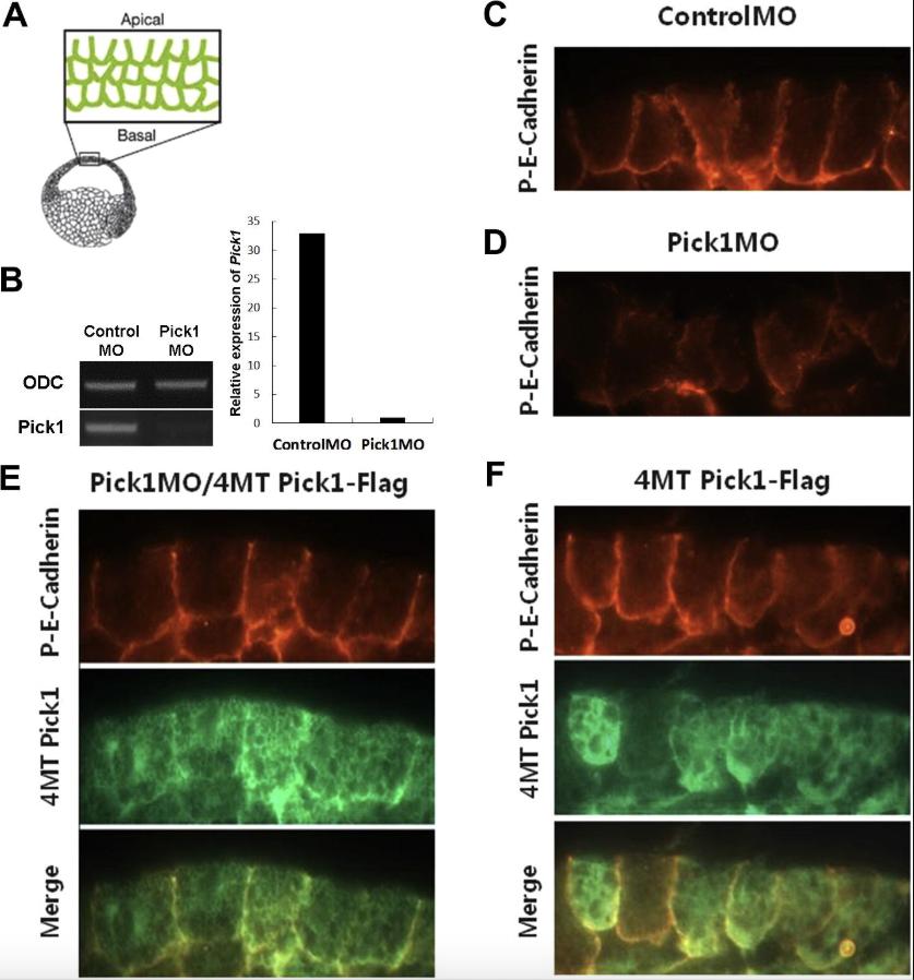 Fig. 3. Pick1 knock-down causes the disruption of AJs. Embryos were injected with or without 20 ng control MO, 20 ng Pick1 MO, and 200 pg 4MT Pick1 RNA in both the blastomeres of 2-cell stage embryos and those collected at stage 10.5. Immunostaining was performed with phospho-E-cadherin and Flag antibodies on cryosections. (A) Experimental scheme. Schematic showing the region of embryo isolated and examined by immunofluorescence microscopy. Adapted from Lee HS et al. [22]. (B) RT-PCR showed that Pick1 expression was significantly down-regulated, while ephrinB1 was not changed in Pick1MO-injected embryos. The histogram shows the relative intensity of Pick1 mRNA expression. (C) ControlMO-injected embryos showed stable localization of phosphorylated-E-cadherin along cellâcell boundaries in cell junctions. (D) Localization of phosphorylated-E-cadherin was greatly diminished in AJs of Pick1MO-injected embryos. (E) The redistribution of phosphorylated-E-cadherin by Pick1MO was significantly rescued by appropriate amounts of 4MT Pick1 RNA. (F) The localization of Pick1 partially overlapped with that of phosphorylated-E-cadherin, indicating that Pick1 can be present in AJs of epithelial cells and over-expressed Pick1 does not affect cell junction formations. Embryos were injected with 20 ng controlMO, 20 ng Pick1MO, and 200 pg 4MT Pick1 mRNA in both the blastomeres of 2-cell stage embryos. 1st row (Red: phosphorylated-E-cadherin), 2nd row (green: Pick1), 3rd row (merged). (For interpretation of the references to color in this figure legend, the reader is referred to the web version of this article.)