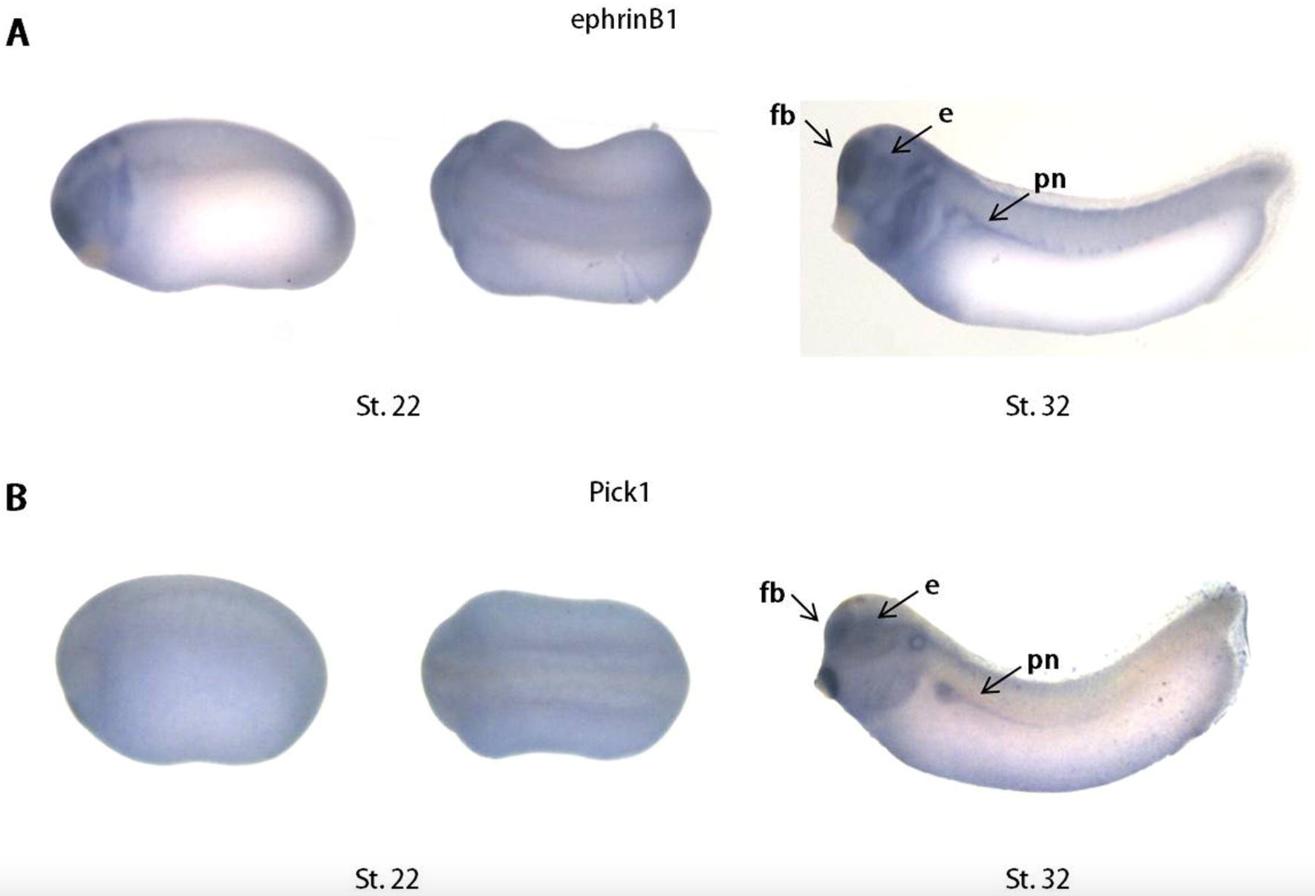 Supplementary Figure 1. The expression patterns of Pick1 and ephrinB1 in Xenopus embryos by in situ hybridization. (A andB) Xenopus embryos were collected at stages 22 and 32, and then processed for whole-mount in situ hybridization using standard methods with digoxigenin-labeled (Roche; Indianapolis, IN, USA) antisense probes for ephrinB1 and Pick1. At stage 32, ephrinB1 and Pick1 were expressed in the forebrain, eye, and pronephros in the uninjected embryos. Abbreviations: fb, forebrain; e, eye; pn, pronephros.