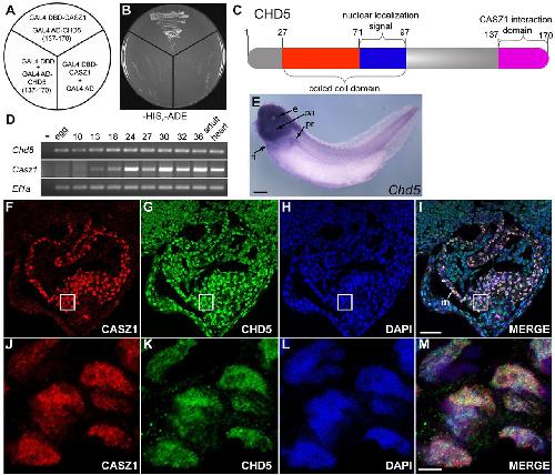 Fig. 1. CASZ1 interacts with CHD5. (A,B) Full-length CASZ1 (bait) interacts with a partial CHD5 protein (prey) in a yeast two-hybrid assay. Cells placed under âHis/âAde selection. (C) Schematic of the structure of CHD5 depicting predicted domains. (D) RT-PCR on cDNA derived from Xenopus whole-embryo lysate. Ef1a was used as a loading control. (E) Expression of Chd5 RNA by in situ analysis in early tadpole Xenopus embryos (stage 37). h, heart; pr, pronephros; e, eye; pa, pharyngeal arches. (F-M) Colocalization of CHD5 and CASZ1 protein in the nuclei of the developing Xenopus (stage 40) myocardium (m). White boxes in F-I correspond to the magnified regions in J-M. Scale bars: 500â