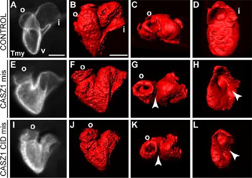 Fig. 8. The CASZ1 CID domain disrupts heart development. (A-D) Control embryos at early tadpole stage (stage 37) exhibit looping and formation of the cardiac chambers. v, ventricle; o, outflow tract; i, inflow tract. (E-L) CASZ1 and CASZ1 CID misexpressing embryos display incomplete convergence of the outflow and inflow tract, as seen in dorsal views (I,K) (arrowheads), and a partially closed inflow tract, as seen in posterior views (H,L) (arrowheads). n=23 for CASZ1 mis; n=29 for CASZ1 CID mis; two biological replicates. Scale bars: 100â