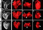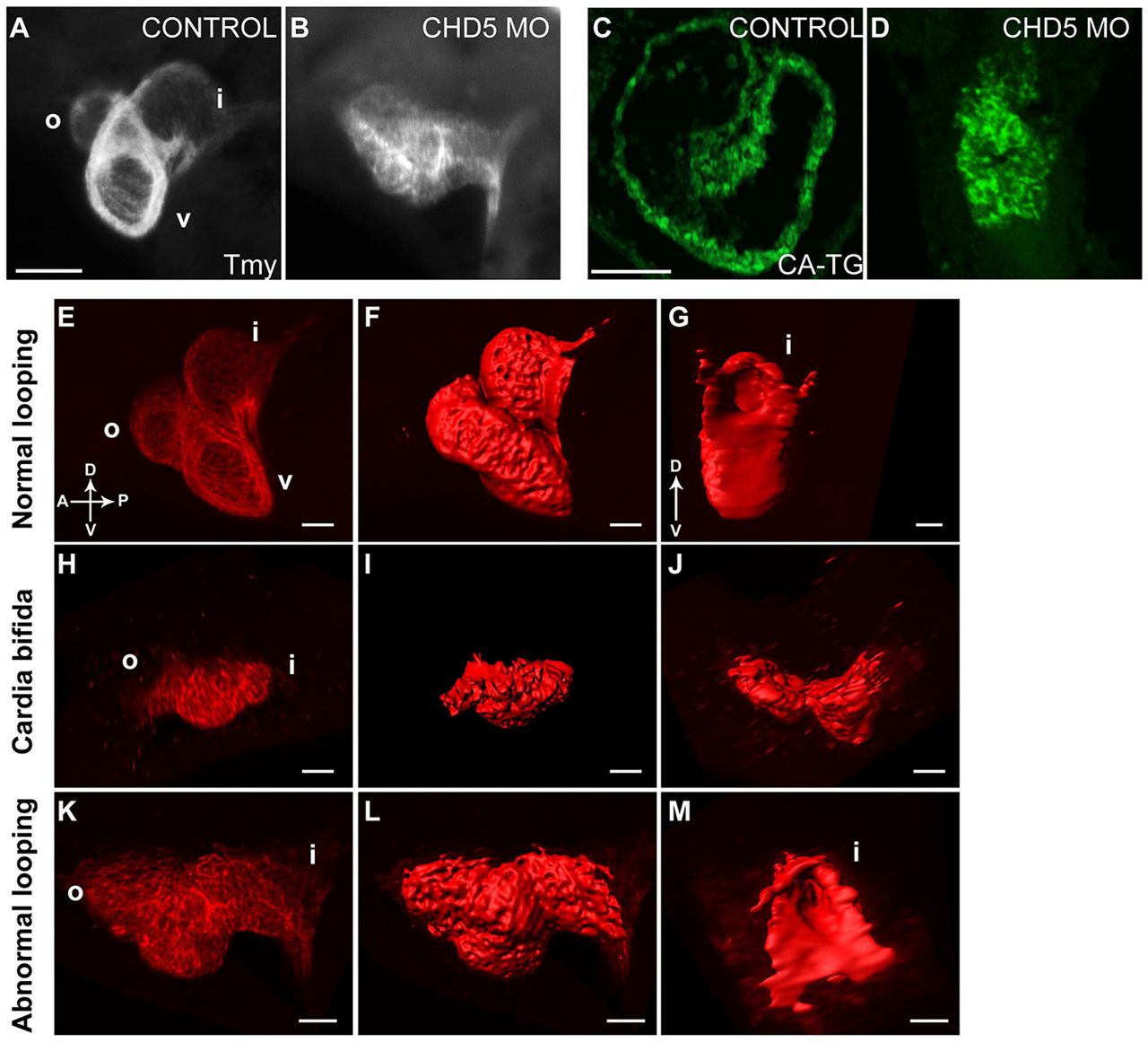 Fig. 2. CHD5 is required for cardiac morphogenesis. (A,B) CHD5-depleted embryos (stage 37) exhibit smaller, improperly looped hearts that fail to undergo chamber formation. Lateral views of whole-mount antibody staining with anti-tropomyosin (Tmy) antibody. (C,D) CHD5-depleted hearts fail to develop fully formed chambers and have a thicker myocardial layer. Transverse sections of cardiac actin-EGFP transgenic (CA-TG) Xenopus embryos (stage 37). (E-M) 3D reconstructions of early tadpole Xenopus embryos (stage 37) stained with anti-tropomyosin antibody viewed laterally and posteriorly. CHD5-depleted hearts (H-M) fail to complete migration and fusion (H-J, 54%), or fail to undergo proper looping and chamber formation (K-M, 31%). Only 15% display normal looping. n>25 per condition, two biological replicates. v, ventricle; o, outflow tract; i, inflow tract. D, dorsal; A, anterior; V, ventral; P, posterior. Scale bars: 100â