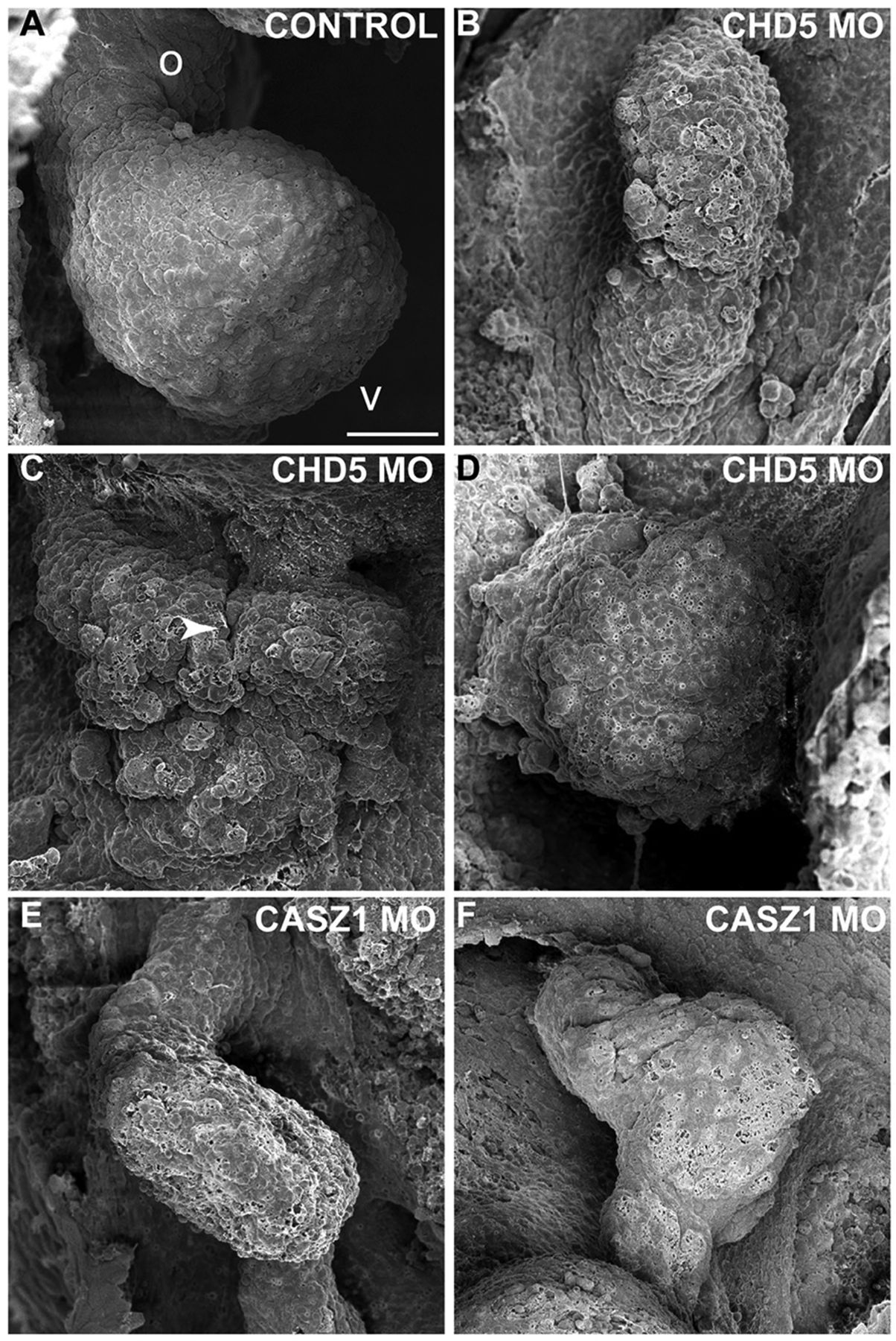 Fig. 3. CHD5 is required for cardiac morphogenesis. (A-D) Scanning electron microcopy (SEM) of Xenopus embryos at early tadpole stage (stage 37) in (A) control and (B-D) CHD5-depleted embryos. CHD5-depleted embryos fail to complete looping and begin chamber formation, and fail to undergo normal cell shape changes associated with development and maturation of the linear heart tube. o, outflow tract; v, ventricle. Arrowhead indicates failure of cardiomyocyte fusion at ventral midline. (E,F) CASZ1-depleted embryos exhibit similar defects in cardiac looping and cardiac cell shape changes. n=10 per condition, two biological replicates. Scale bar: 50â