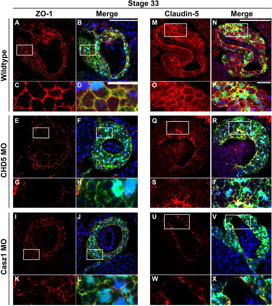 Fig. 6. CASZ1 and CHD5 are required for myocardial tissue adhesion prior to cardiac looping and chamber formation. (A-X) Control, CHD5-depleted and CASZ1-depleted CA-GFP embryos were examined for expression of the tight junction markers ZO-1 (A-L) and claudin-5 (M-X). Expression of both ZO-1 and claudin-5 is reduced and appears diffuse and unorganized in transverse sections of CHD5- and CASZ1-depleted hearts (stage 33). Phenotypes represented across multiple sampled embryos (nâ¥4). White boxes in A,B,E,F,I,J,M,N,Q,R,U,V correspond to magnified images in C,D,G,H,K,L,O,P,S,T,W,X, respectively. Merge represents ZO-1 or claudin-5 (red), DAPI (blue) and CA-GFP (green). Scale bars: 100â