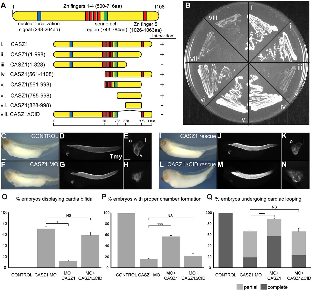 Fig. 7. CHD5 is crucial for CASZ1 function. (A,B) The region of CASZ1 containing the minimal CHD5-interacting domain amino acid residues 785-998 was identified using a yeast two-hybrid assay. (C-N) Control (C-E) and CASZ1-depleted (F-H) Xenopus embryos compared with CASZ1-depleted embryos co-injected with mRNA encoding either full-length CASZ1 (I-K) or CASZ1δCID (L-N) at early tadpole stage (stage 37). Full-length CASZ1 partially rescued cardiac looping and chamber formation (v), and outflow tract (o) and inflow tract (i) formation, whereas CASZ1δCID failed to rescue any aspect of cardiogenesis. (O-Q) Three independent experiments (n>20 per condition) of embryos were scored for cardia bifida (O), degree of proper cardiac looping (P) and chamber formation (Q) using whole-mount staining with anti-tropomyosin antibody. Fisher's exact test was performed for significance: NS, not significant; *P=0.003; ***P<0.0001. Error bars represent calculated s.e.m. Scale bars: 500â