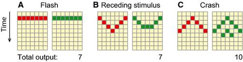 Figure 8. Conceptual model of a reverberation network acting as a collision detector (see 4 for details). In every panel the leftgrid represents a one-dimensional ‘retina’, and the rightgrid represents a one-dimensional ‘tectum’; rows correspond to discrete time steps (time running from top to bottom), and columns correspond to ‘RGCs’, or retinotopically arranged ‘tectal cells’, accordingly. Cells that spike during the current time frame are shown as dark and silent cells are pale. (A) Response to instantaneous ‘flash’. (B) Response to reversed looming, or receding stimulus. (C) Response to looming stimulus, or ‘crash’. Total cumulative spiking output in the ‘tectum’ is stronger for ‘crash’ (10 spikes) than for either ‘flash’ or receding stimulus (seven spikes each).