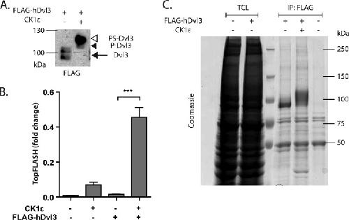 FIGURE 1. Co-expression of CK1ϵ with FLAG-Dvl3 retards electrophoretic migration and induces phosphorylation-dependent shift of Dvl (PS-Dvl3) (A) and induces TCF/LEF-dependent transcription as shown by TopFlash assay. Samples were analyzed by one-way analysis of variance followed by Tukey post tests. ***, p < 0.001, n = 3 (B). C, representative example of Coomassie Brilliant Blue R-stained gel used for MS/MS analysis. See the details “Experimental Procedures.”
