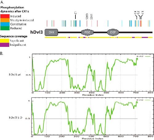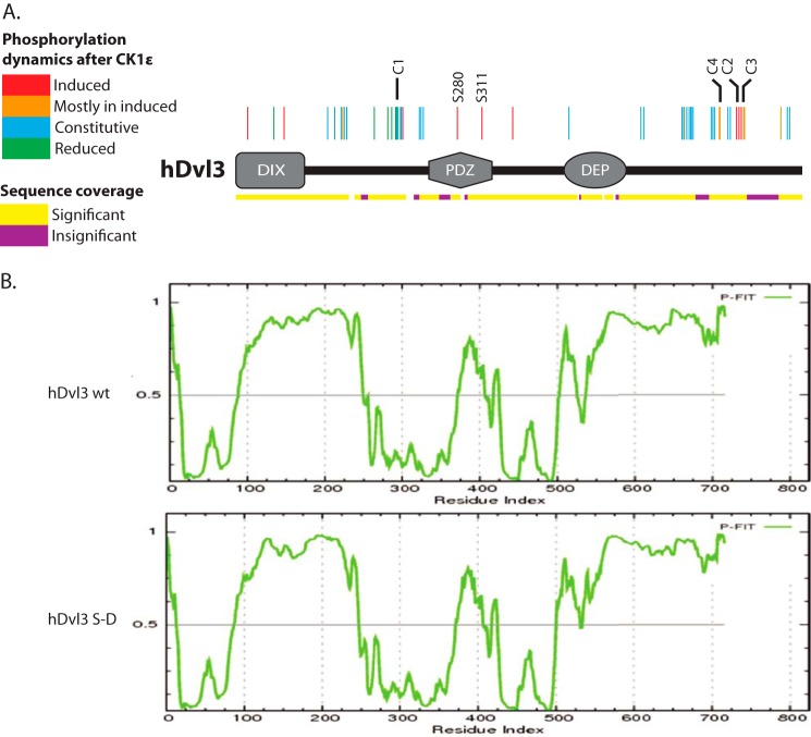 FIGURE 2. A, Dvl3 phosphorylation (summary of MS/MS data). Position and dynamics of detected phosphorylations is indicated by color coded lines: green, less frequent in CK1ϵ induced samples; blue, constitutive; orange, more often in CK1ϵ-induced samples; red, only in CK1ϵ-induced samples. The yellow/violet lines indicate hDvl3 protein coverage in the MS/MS analysis (yellow, significant identification; violet, insignificant identification). C1, C2, C3, C4, Ser-280, and Ser-311 labels indicate the position of residues mutated in the study. B, secondary structure of Dvl3 as predicted by PONDR-FIT software (upper panel). Structured regions are indicated by values <0.5 and unstructured by values >0.5. Accuracy of the prediction is confirmed by the identification of DIX, PDZ, and DEP domains as regions with secondary structure. In silico mutation of all identified phosphorylated Ser/Thr sites in the basic region and C terminus for Asp did not lead to the massive changes in the secondary structure (lower panel).