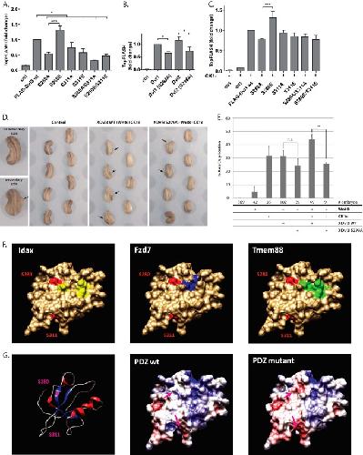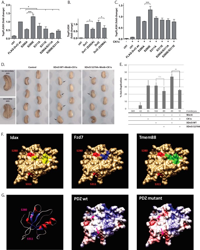 AâC, HEK 293t cells were transfected with the indicated Dvl3 constructs, TopFlash reporter plasmid, plasmid encoding Renilla luciferase as an internal control, and CK1ϵ. A, mutations of Ser-280 and Ser-311 prevent efficient activation of Wnt/β-catenin by Dvl3. B, the function of Ser-280 is conserved in Dvl1 and Dvl2. Dvl1-S282A and Dvl2-S298A, corresponding to Dvl3 S280A, activated the Wnt/β-catenin pathway less efficiently than WT Dvl1 and Dvl2, respectively. C, in CK1ϵ-treated samples no significant differences between the WT Dvl3 and the mutant Dvl3 were detected. Samples were analyzed by one-way analysis of variance followed by Tukey post tests. *, p < 0.05; ***, p < 0.001; number of experiments â¥4. D, ventral overexpression of XDvl3 induced partial secondary body axes in Xenopus embryos. This phenotype reflects activation of the Wnt/β-catenin pathway in vivo. Images of one normal embryo and one embryo with a secondary axis are shown in larger magnification in addition to representative sets of embryos injected as indicated. The secondary body axes are indicated by arrows. E, the graph shows the average percentage of embryos that developed a secondary body axis from at least three independent experiments; error bars indicate the standard error, and asterisks indicate statistically significant deviation compared with overexpression of Dvl3-WT (t test, p > 0.99). F, interaction sites of Idax (in yellow), Fzd7 (in blue), and Tmem88 (in green) proteins determined for mouse Dvl1 PDZ domain (PDB ID 1MC7). Phylogenetically conserved Ser-280 and Ser-311 phosphorylation sites in human Dvl3 PDZ are shown in red. G, left panel, schematic representation of secondary structure of mouse Dvl1 PDZ domain. Central panel, modeled electrostatic surface potential of mDvl1 PDZ. Right panel, electrostatic surface potential of mDvl1 PDZ bearing phosphomimicking mutations at positions corresponding to Ser-280 and Ser-311 of human Dvl3 PDZ. Phosphorylation sites are highlighted in magenta (magenta arrow). Calculations of electrostatic surface potential were performed in UCSF Chimera software.