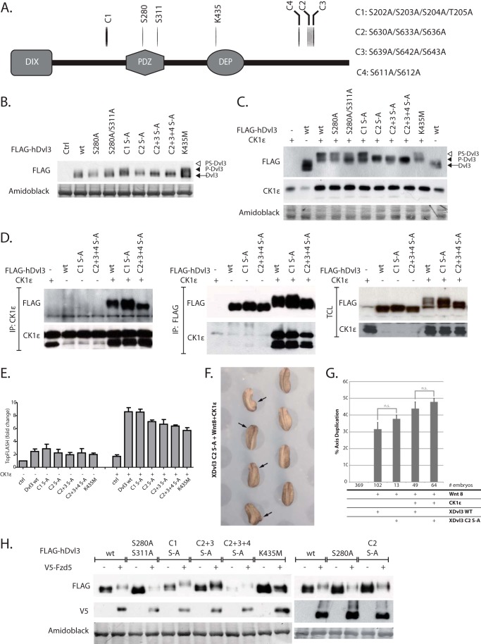 A, representation of Dvl structure with the positions of mutated residues. B and C, HEK293t cells were transfected with the indicated plasmids, and the electrophoretic migration of Dvl3 in the absence (B) and presence (C) of CK1ϵ was analyzed by Western blotting with anti-FLAG antibody. Mutations in C2, C2+3, and C2+3+4 blocked PS-Dvl3 induction by CK1ϵ (C). The protein expression levels of individual mutants were comparable. D, the ability of individual Dvl3 mutants to interact with CK1ϵ was tested by immunoprecipitation (IP) of CK1ϵ and FLAG-Dvl3 and subsequent analysis by Western blotting (total cell lysate (TCL)). E, HEK293t cells were transfected with the indicated plasmids, and the ability to activate TCF/LEF-dependent transcription was assessed by TopFlash system. None of the C1, C2, C2+3, C2+3+4 mutants showed any statistically significant difference. Statistical differences were analyzed by one-way analysis of variance followed by Tukey post tests. Number of experiments n ≥ 3. F and G, XDvl3 S625A/S628A/S631A (XDvl3 C2 S-A) induced secondary body axes in Xenopus embryos at the same rate as XDvl3 WT. F, the image shows a representative set of embryos injected as indicated. G, the graph summarizes the average percentage of embryos that developed a secondary body axis from at least three independent experiments; error bars indicate the standard error. n.s., not significant. H, HEK293t cells were transfected with the indicated plasmids, and the electrophoretic mobility of Dvl3 after V5-Fzd5 coexpression was analyzed by Western blotting. With the exception of Dvl3-K435M, electrophoretic mobility of all Dvl3 mutants was indistinguishable from wild type.