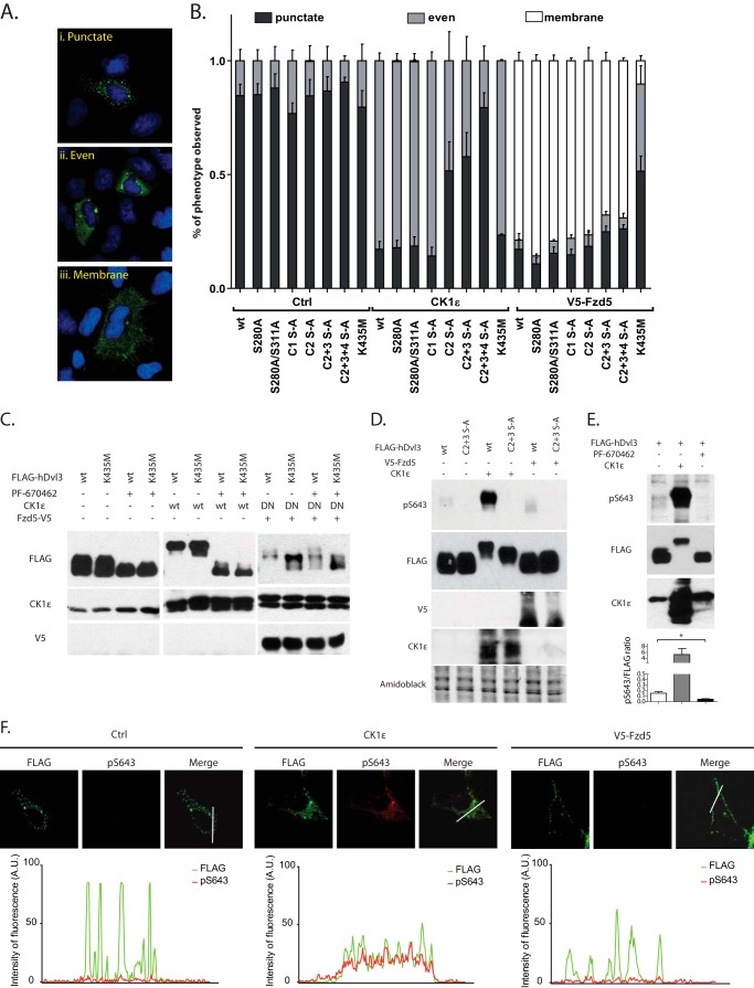 A, representation of typical distribution patterns of Dvl3. (i), punctate; (ii), even, (iii), membrane. B, HEK293t cells were transfected with corresponding plasmids and fixed, and Dvl3 was stained with anti-FLAG antibody. Distribution pattern of Dvl3 was analyzed in at least 100 cells. CK1ϵ is unable to promote even localization of Dvl3 in C2, C3, and C4 S-A mutants, whereas V5-Fzd5 changes the intracellular distribution of Dvl3 to membranous in all tested constructs with the exception of Dvl3K435M, which served as a positive control. C, HEK293t cells were transfected with corresponding plasmids and treated as indicated with 10 μm CK1δ/ϵ inhibitor PF-670462. Inhibition of CK1δ/ϵ activity resulted in faster migration of FLAG-hDvl3 in control and CK1ϵ-induced conditions. In conditions with FLAG-hDvl3 coexpressed with V5-Fzd5 and dominant negative (DN) CK1ϵ-P3, acceleration of FLAG-hDvl3 electrophoretic mobility was observed only in mutant K435M. This finding confirms that CK1ϵ is and K435 is not dispensable for V5-Fzd5-induced phosphorylation of FLAG-hDvl3. D, phospho-Ser-643-Dvl3 was detected using anti-Ser(P)-643-Dvl3-specific antibody by Western blotting. Total Dvl3 was detected by anti-FLAG antibody. Anti-Ser(P)-643-Dvl3-specific antibody does not detect Dvl3 C2+C3 S-A mutant, but it strongly recognizes Dvl3 co-expressed with CK1ϵ. E, inhibition of endogenous CK1ϵ blocks signal detected by anti-Ser(P)-643-Dvl3 specific antibody. Decline in signal intensity was confirmed by Western blot quantification. CK1ϵ overexpression serves as a positive control. F, phospho-Ser-643-Dvl3 was detected by immunocytochemistry in HEK293t cells transfected with the indicated combination of plasmids. The signal of anti-Ser(P)-643-Dvl3 antibody (red) is negligible for Dvl3 expressed either alone or in combination with Fzd5 but strong for evenly distributed Dvl3 after CK1ϵ co-expression. Total Dvl3 detected by anti-FLAG antibody is shown in green. All confocal images were acquired using the same laser/detector settings and subsequently quantified using ImageJ software. Graphs show the overlap of fluorescence intensity peaks of individual channels along profiles indicated in the merged micrographs by a white line. A.U., arbitrary units.