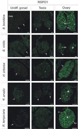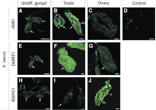 Sexual dimorphism of AMH, DMRT1 and RSPO1 localization in the developing gonads of six anuran species.