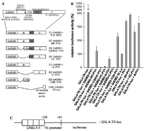 binding or toxicity of effector proteins. GAL4-TK-luc exhibited highly enhanced reporter gene expression. G4DBD-PV1 (1), G4DBD-1/2NHC-PV1