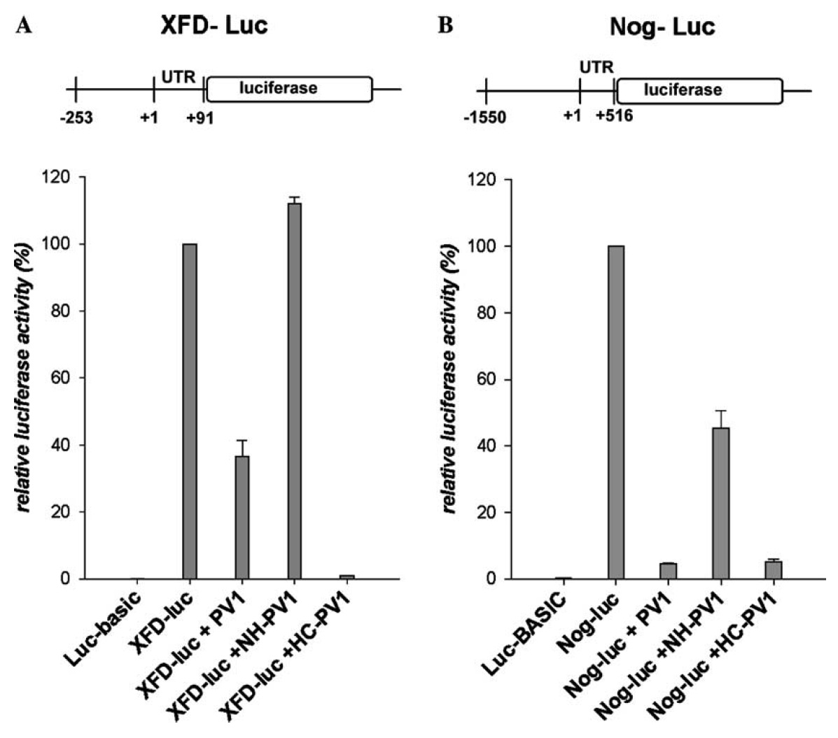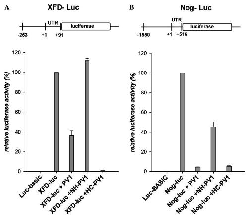 Fig. 5. Luciferase assay for XFD-10 promoter and Noggin promoter in response to deletion mutants of PV.1. mRNAs encoding NH-PV1, HC-PV1,
