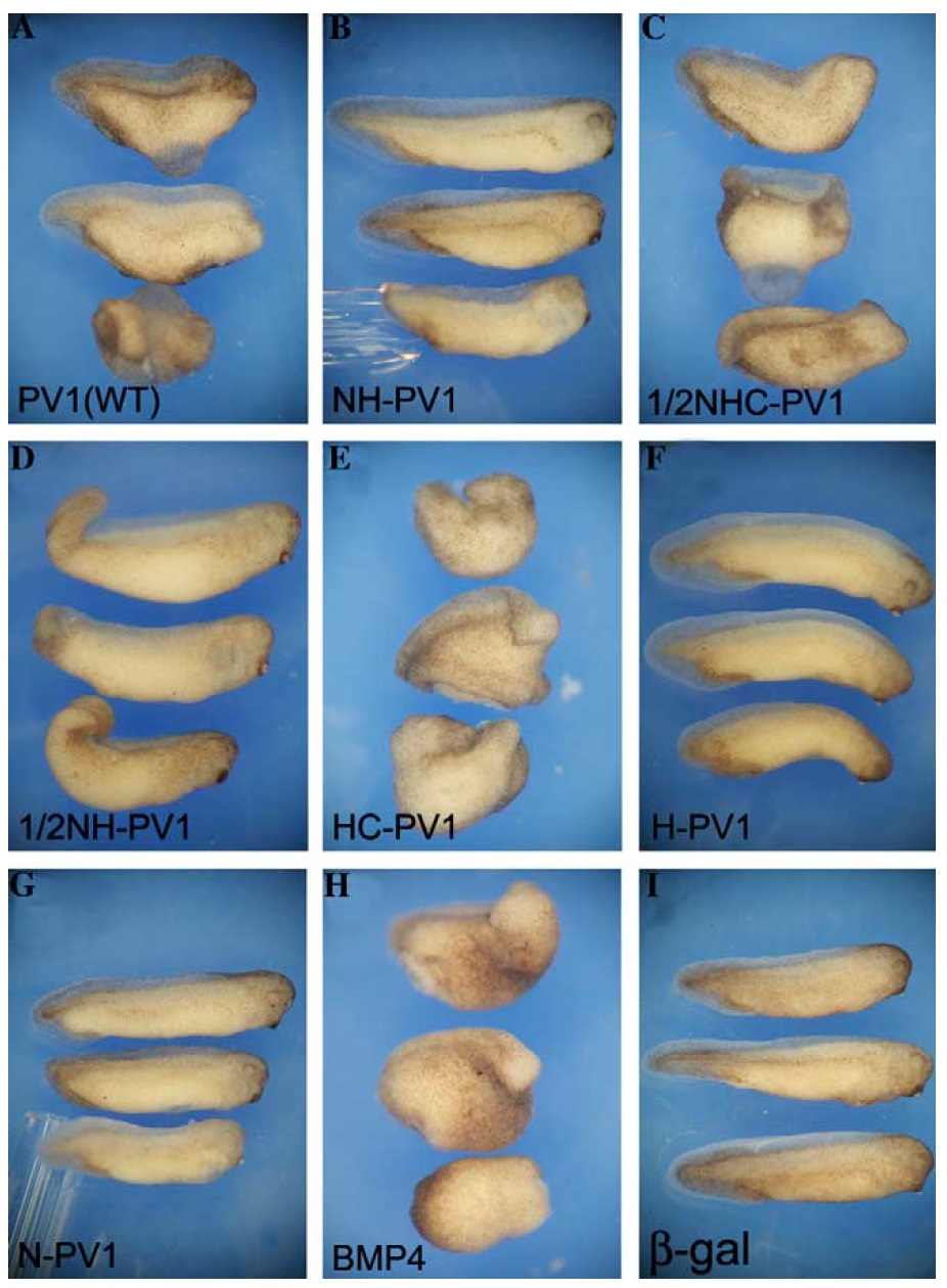 Fig. 4. HC-PV1 ventralizes dorsal mesoderm. Four-cell stage embryos were injected with PV.1, NH-PV1, and HC-PV1 mRNAs at their dorsal