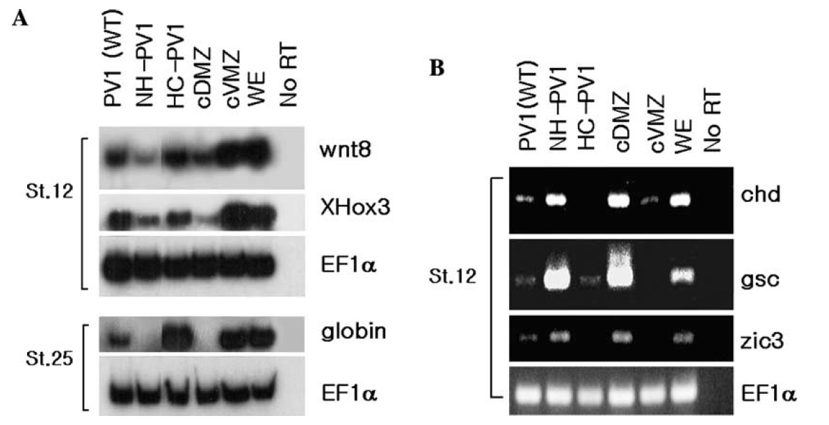 RNA extraction. PV.1 and HC-PV1 overexpression induces ventral marker genes (A) and suppresses dorsal specific early genes (B) while NH-PV1