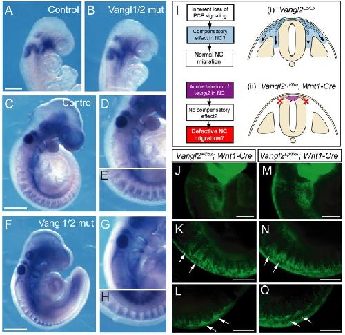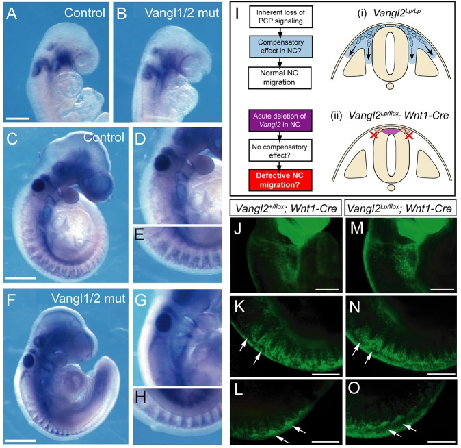Fig. 3. Normal NC migration in Vangl1/2 double mutants and after acute Vangl2 downregulation in the NC lineage. (A-H) Control (A,C-E; Vangl1gt/+; Vangl2Δ/+) and double-mutant (B,F-H; Vangl1gt/gt; Vangl2Δ/Δ) embryos exhibit normal migration of Erbb3-positive cranial NC (E8.5; A,B) and cranial/trunk NC (E9.5; C-H). Acute NC downregulation of Vangl2 to test for a possible compensatory mechanism in Vangl2Lp/Lp embryos (I) reveals identical YFP-positive NC migration in control (J-L; Vangl2+/flox; Wnt1-Cre) and downregulation (M-O; Vangl2Lp/flox; Wnt1-Cre) E9.5 embryos. Arrows indicate comparable streams of NC cells migrating from the trunk neural tube in both genotypes. Scale bars: 200 µm in A; 500 µm in C,F; 100 µm in J-O.