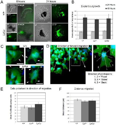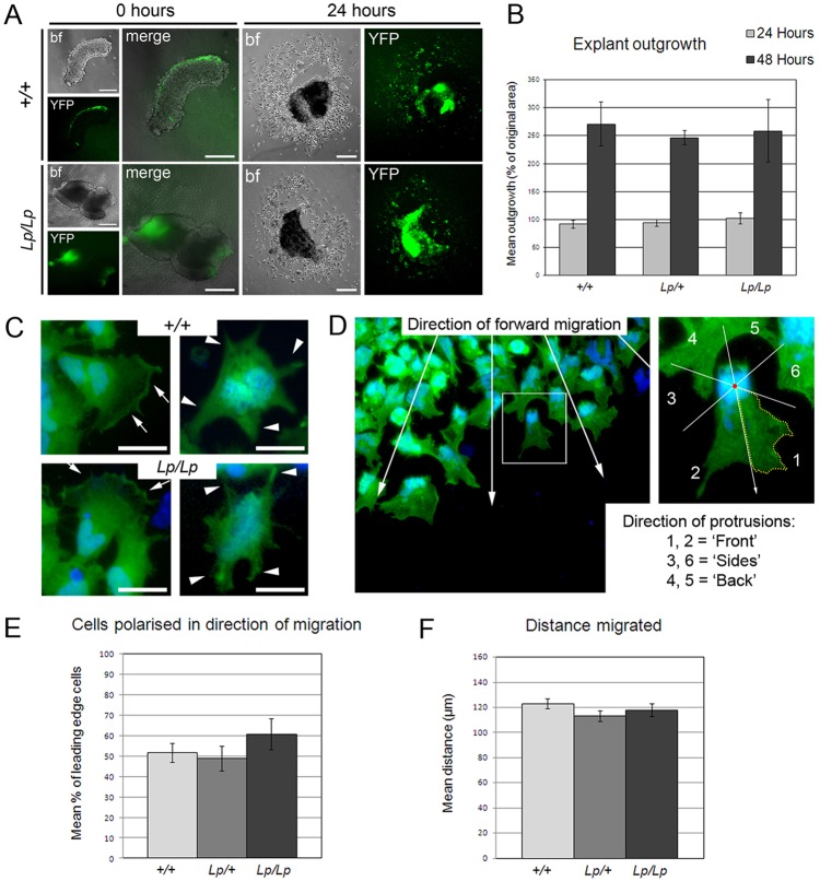 Fig. 4. NC cells migrate similarly from Vangl2+/+ and Vangl2Lp/Lp explant cultures. YFP-positive NC are initially (0 h; A) on the dorsal margin of Vangl2+/+; Wnt1-Cre/YFP (+/+) explants and on Vangl2Lp/Lp; Wnt1-Cre/YFP (Lp/Lp) neural fold tips. Cells emerge in similar numbers (at 24 h; A), with no difference in outgrowth area (P=0.91, one-way ANOVA; B). Leading edge NC cells (anti-GFP/YFP; DAPI) are polarised (C, arrows) or non-polarised (C, arrowheads). Analysis of leading edge cells (D) reveals no difference between genotypes in the proportion of polarised cells nor in the mean distance migrated (P=0.42, E; P=0.21, F; one-way ANOVA). bf, bright field. Error bars indicate s.e.m. At least three explants were studied per genotype and time point. Scale bars: 200 µm in A; 50 µm in C.