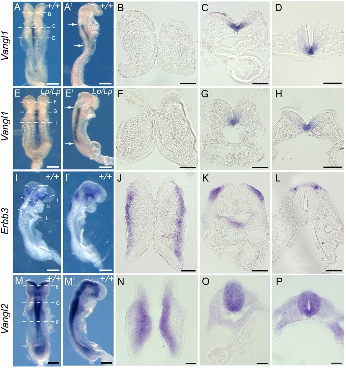 Fig. 2. Vangl1 is not expressed in wild-type NC, nor ectopically in Vangl2Lp/Lp mutants. WISH in intact embryos shown from dorsal (A,E,I,M) and right lateral (A′,E′,I′,M′) views, and in sections (B-D,F-H,J-L,N-P) at levels indicated by dashed lines in A,E,I,M. Vangl1 mRNA expression is confined to midline neuroepithelium, from hindbrain to low trunk (arrows), in E8.5 wild-type embryos (+/+; A-D). There is no ectopic expression in Vangl2Lp/Lp embryos (Lp/Lp; E-H) nor overlap with Erbb3-positive NC (I-L). Vangl2 is expressed throughout the neuroepithelium (M-P), overlapping with Vangl1 only in midline cells, and not overlapping with Erbb3. Scale bars: 200 µm.