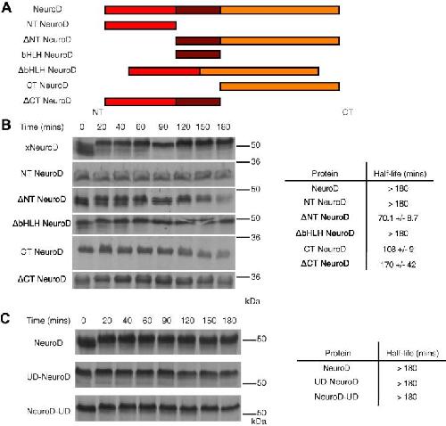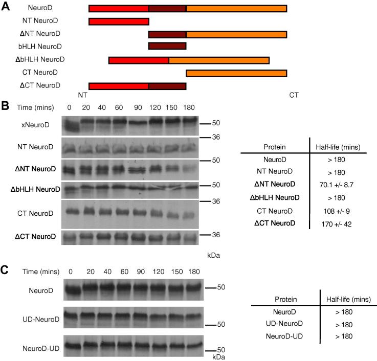 Fig. 2. Stability of NeuroD domains and fusions between NeuroD and an unfolding domain. (A) Schematic of NeuroD domain deletion mutants. (B) NeuroD domain deletion mutants were subjected to degradation assay in interphase egg extract. n = 3. (C) Unfolding domain-fused (UD) proteins were subjected to degradation assay in interphase egg extract. n = 3.