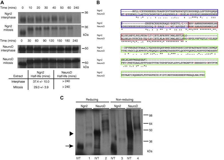 Fig. 1. Ngn2 is degraded whilst NeuroD is stable despite being ubiquitylated. (A) X. laevis interphase and mitotic egg extracts were supplemented with IVT 35S-labelled Ngn2 or NeuroD and incubated at 21 °C. Samples at increasing time points were analysed by SDSâPAGE followed by autoradiography and quantitative phosphorimaging analysis, calculating the half-lives using first-order rate kinetics, and errors calculated using the Standard Error of the Mean (SEM). n = 2. (B) ClustalW2 [20] analysis of sequences from Ngn2 and NeuroD. The N-terminal domain is bordered in blue; the bHLH domain in red; and the C-terminal domain in green. Lysine residues are highlighted in red. (C) Interphase egg extracts were supplemented with IVT 35S-labelled Ngn2 or NeuroD in the presence of MG132 and His6-ubiquitin and incubated at 20 °C for 90 min. Samples were bound to NiâNTA beads and subjected to SDSâPAGE in reducing or non-reducing conditions and analysed by autoradiography. Lanes are numbered 1â4 as described in the text. n = 2. (For interpretation of the references to colour in this figure legend, the reader is referred to the web version of this article.)