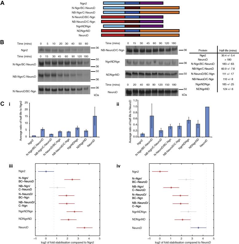 Fig. 3. Analysis of stability of domain-swapped mutants of Ngn2 and NeuroD. (A) Schematic representation of Ngn2 and NeuroD domain-swap proteins. (B) Domain-swapped proteins were subjected to degradation assay in interphase egg extract. n = 4. (C) The average stabilisation relative to wild type (i) Ngn2 and (ii) NeuroD was calculated. Analysis of variance (ANOVA) was performed to determine which proteins were significantly different from (iii) Ngn2 and (iv) NeuroD and these are shown as red bars (reference proteins denoted by blue bars; grey bars show no significant difference from wild type). (For interpretation of the references to colour in this figure legend, the reader is referred to the web version of this article.)