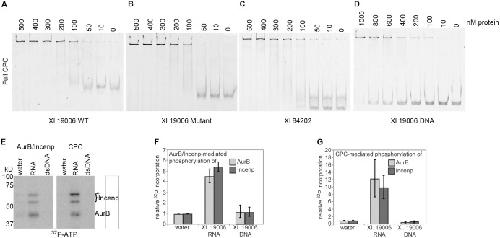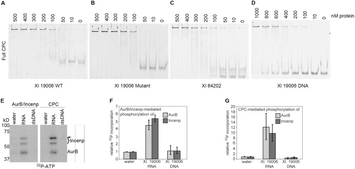 Figure 3. The CPC binds to and is stimulated by RNA in vitro.Binding of full, recombinant CPC to A) AurB-interacting Xl. 19006 RNA, B) Xl. 19006 RNA lacking the poly-A motif shown in Fig. 2, C) negative control Xl. 84202 RNA, D) PCR product encoding the RNA shown in (A). E) Phosphorylation of Incenp and AurB in vitro by purified AurB/Incenp or full CPC in the presence or absence of RNA or double-stranded DNA. Incenp band marked with arrow is quantified in F. Single gel image is shown, with intervening lanes omitted. F–G) Quantification of signals indicated in (E) from 3 independent experiments. Error bars represent SEM. |