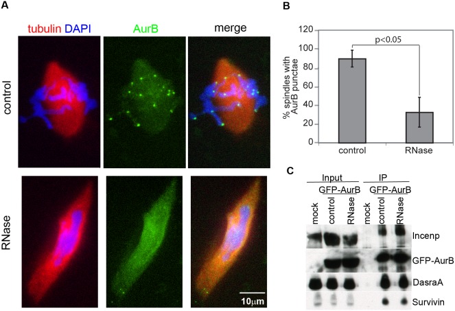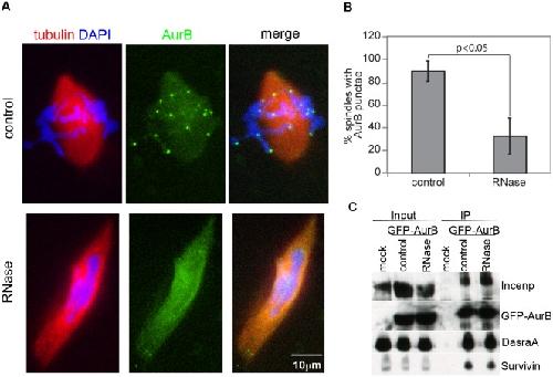 Figure 4. RNA is required for AurB localization to centromeres.A) Localization of GFP-AurB to centromeres in control and RNase-treated spindles. Images shown are projections. B) Percentage of spindles showing chromosomal AurB punctae. Spindles were scored as positive if at least 6 punctae were visible. (n = 3 extracts, 50–100 spindles per extract, p<0.05 by paired t-test). Error bars represent SEM. C) Coprecipitation of the core CPC members–Incenp, DasraA, and Survivin–with GFP-AurB from control or RNase-treated extracts. Immunoprecipitation from extract lacking GFP-AurB (“mock”) is shown as a control. Input amounts are shown. Results are representative of experiments performed at least in triplicate. |