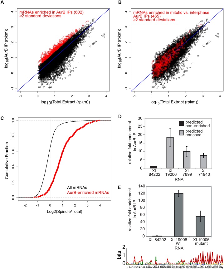 Figure 2. Active AurB binds a distinct subset of transcripts that overlaps with RNAs found on spindles, and a degenerate primary sequence RNA motif mediates AurB recognition.A) Scatter plot showing enrichment of a subset of transcripts (red) in mitotic AurB immunoprecipitations from biological triplicates. B) Scatter plot showing transcripts bound to AurB in interphase extracts. Transcripts specifically bound in metaphase but not in interphase are indicated with red points. C) Cumulative distribution curve showing fraction of total or AurB-bound transcripts as a function of their enrichment on spindles. D) qPCR detection of transcripts predicted by sequencing analysis to be enriched or not enriched in AurB immunoprecipitations. (n = 3 extracts). E) Bottom: Sequence logo [77] showing a poly-A motif enriched in AurB-bound RNAs, but not in transcripts from total RNA. Top: Binding of AurB to in vitro transcribed fragments of Xl. 19006 containing the WT motif (“WT”) or harboring mutations in the 41 nt motif (“mutant”), with each purine mutated to the other purine, and each pyrimidine mutated to the other pyrimidine (see Methods). Binding to in vitro transcribed Xl. 84202 is shown as a negative control. Transcripts were added to extract, and AurB was immunoprecipitated as in (C) n = 3 extracts. (D–E) All error bars represent SEM. |