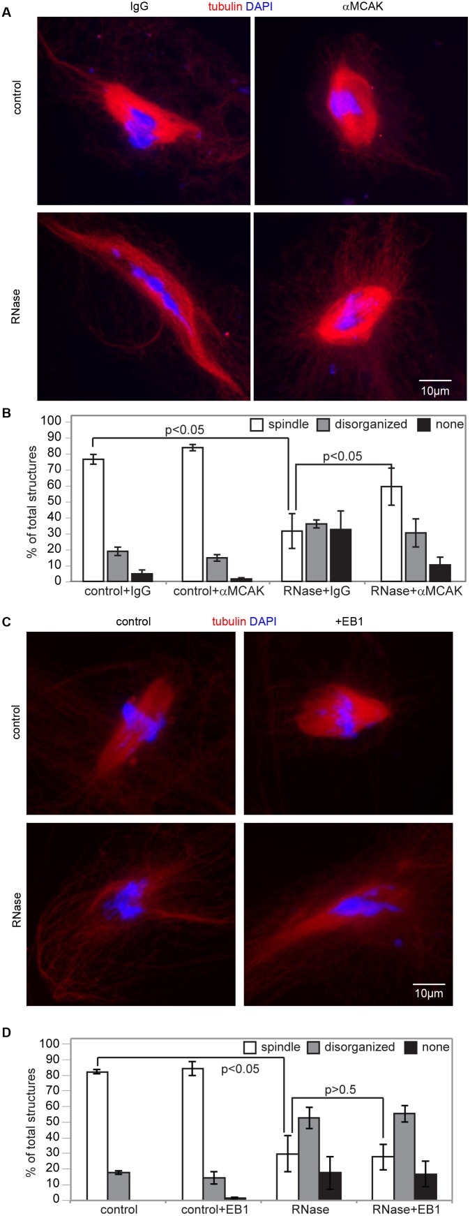 Figure 6. Spindle defects in the absence of RNA arise from aberrant regulation of MCAK.A) Spindles formed in extracts (+/− RNase) in the presence of nonspecific or αMCAK antibodies. An example of a rare spindle in control RNase-treated extracts is shown. All spindle reactions contained CyclinB Δ90. Images shown are projections. B) Spindle assembly efficiency in extracts shown in (A). “None” indicates that no microtubule structures formed around nuclei. (n = 4 extracts, >100 nuclei per extract, p<0.05 by paired t-test). Error bars represent SEM. C) Examples of spindle assembly in control and RNase-treated extracts in the presence or absence of 750 nM EB1-GFP. Disorganized structures formed in RNase-treated extracts are shown. Images shown are projections. D) Spindle assembly efficiency in extracts shown in (C). (n = 3 extracts, >100 nuclei per extract p<0.05 for control vs RNase-treated p>0.5 for RNase +/− EB1 by paired t-test). Error bars represent SEM. |