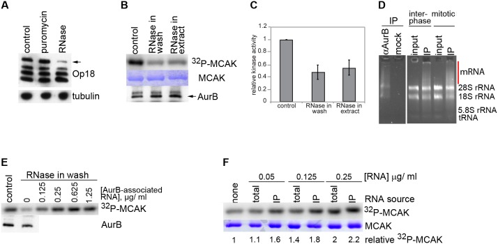 Figure 1. AurB is an RNA-dependent kinase. A) Hyperphosphorylation of Op18 in control extracts, or extracts treated with puromycin or RNase, containing sperm nuclei at a concentration of 5000 nuclei/µl. Arrow indicates AurB-dependent hyperphosphorylated form of Op18, as detected by western blot. Tubulin is shown as a loading control. B) Phosphorylation of MCAK N-terminus by AurB immunoprecipitated from control or RNase-treated extracts containing sperm nuclei, and washed +/â RNase following IP. MCAK substrate and AurB amounts are shown as loading controls. C) Quantitation of signals shown in (B). nâ=â4â5 experiments, error bars are SEM. D) RNA isolated from mock or αAurB IPs. RNA from input (total) extract is shown as a control. RNA was isolated from interphase or mitotic extracts. Red bar highlights transcripts enriched in AurB IPs. E) Rescue of RNase-washed AurB kinase activity by transcripts associated with AurB following stimulation with chromatin. Immunoprecipitations were split into aliquots containing equal amounts of beads during the final wash. One aliquot of each sample was analyzed by western blot as a loading control (lower panel), and remaining aliquots were used for kinase reactions (upper panel). F) Rescue of kinase activity as in (C) with total or AurB-binding RNAs. E-F) Gels are representative of experiments performed at least in duplicate. |