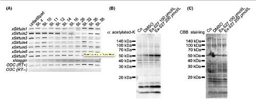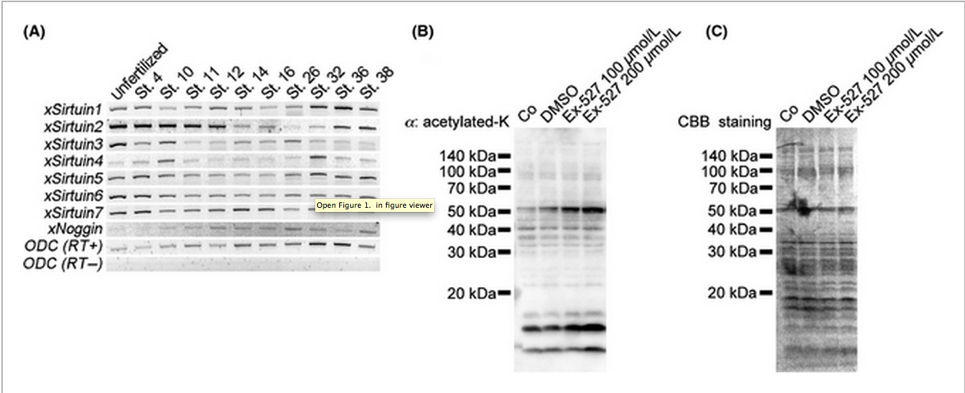 Figure 1. Expression of xSirtuins and inhibition of xSirtuin1 activity by Ex-527 treatment. (A) Reverse transcriptionâpolymerase chain reaction (RTâPCR)analyses for xSirtuin1 to 7 mRNA expressions from unfertilized egg to tadpole stage. All xSirtuins are consecutively expressed in Xenopus embryos. (B) Western blot analysis of acetylated-lysine in Ex-527-treated embryos. Embryos were treated at the 2-cell stage with 100 and 200 μmol/L of Ex-527, and extracts were collected 12 h later. Predictable band size of p53 is 53 kDa. (C) CBB staining for SDS-PAGE gel. Total amounts of proteins were not changed by any treatments.