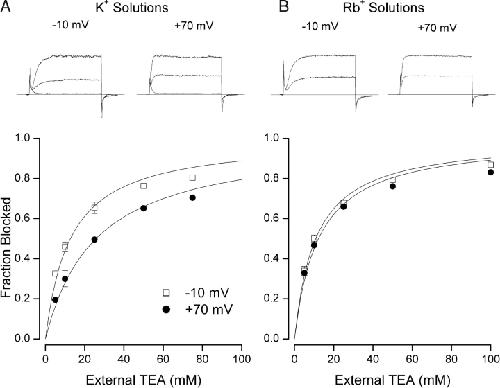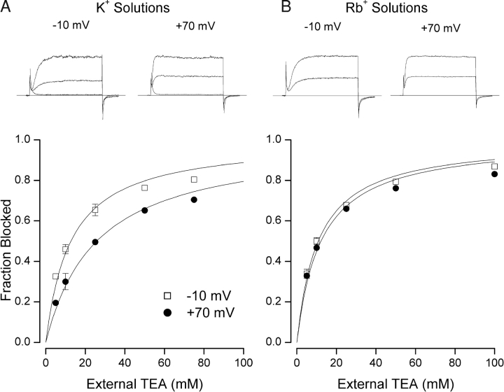 Figure 1. . External TEA block of Shaker K+ channels. (A) TEA block in K+ solutions (5 mM external K+//135 mM internal K+). (Top) Raw current records obtained with step changes in membrane potential from −70 mV to the indicated voltages. Lower record of each pair recorded in the presence of 20 mM TEA. Superimposed on each set of records is the current at the indicated voltage recorded from an uninjected oocyte illustrating the lack of any significant endogenous currents. The current records have not been leak corrected- the small current from the uninjected oocyte is likely through the ∼7 GΩ seal resistance. (Main) Fraction of channel current block by external TEA at −10 (□) and 70 mV (•), respectively. Lines are fits of Eq. 1 to the data with Kapp values of 12.3 ± 0.81 and 25.2 ± 1.4 mM at −10 and 70 mV, respectively. (B) TEA block in Rb+ solutions (5 mM external Rb+//135 mM internal Rb+). (Top) Raw current records obtained with step changes in membrane potential from −70 mV to the indicated voltages. Lower record of each pair recorded in the presence of 20 mM TEA. (Main) Fraction of channel current block by external TEA at −10 (□) and 70 mV (•), respectively. Lines are fits of Eq. 1 to the data with Kapp values of 10.9 ± 0.74 and 12.5 ± 1.2 mM at −10 and 70 mV, respectively.